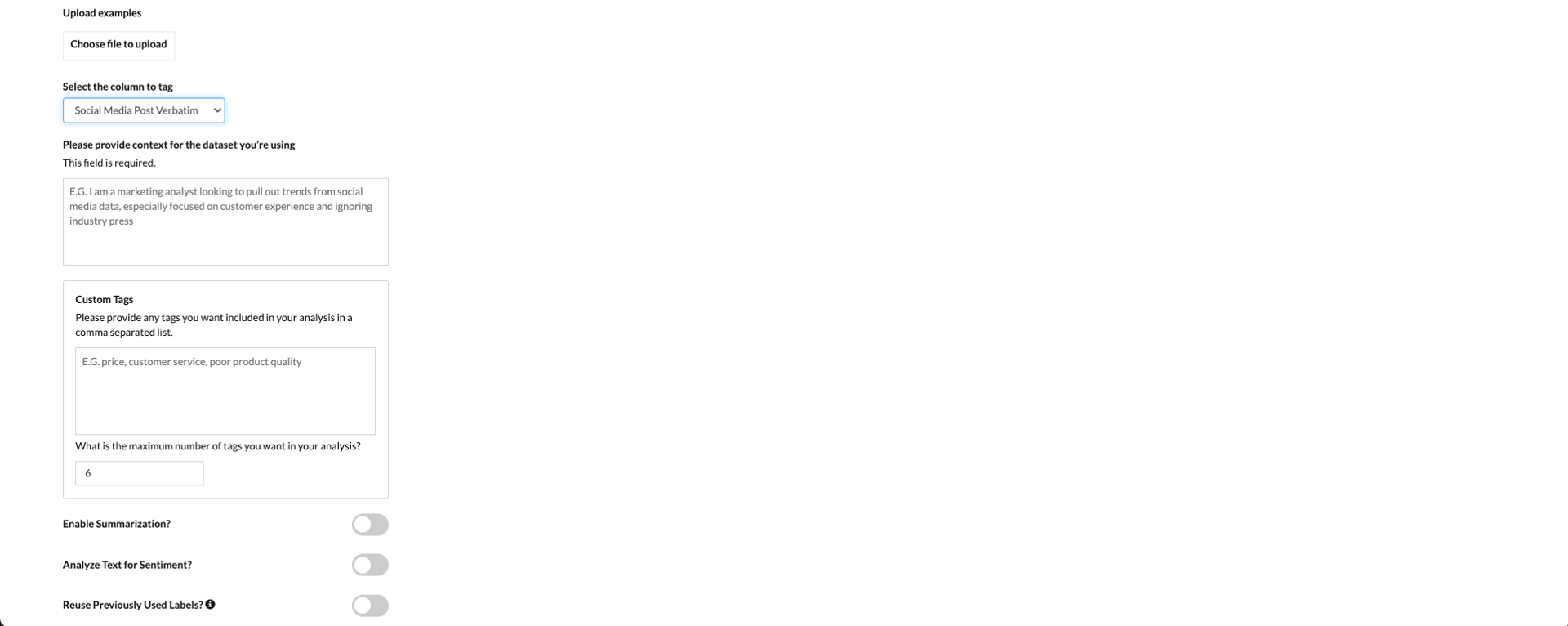 For example: “I am a marketing analyst looking to pull out trends from social media data, especially focused on customer experience and ignoring industry press.” - Add Custom Tags - (Optional) If you already know the themes or concepts you want to tag, you can list them here. For example: price, customer service, poor product quality. You can leave this blank for a fully exploratory (greenfield) analysis.