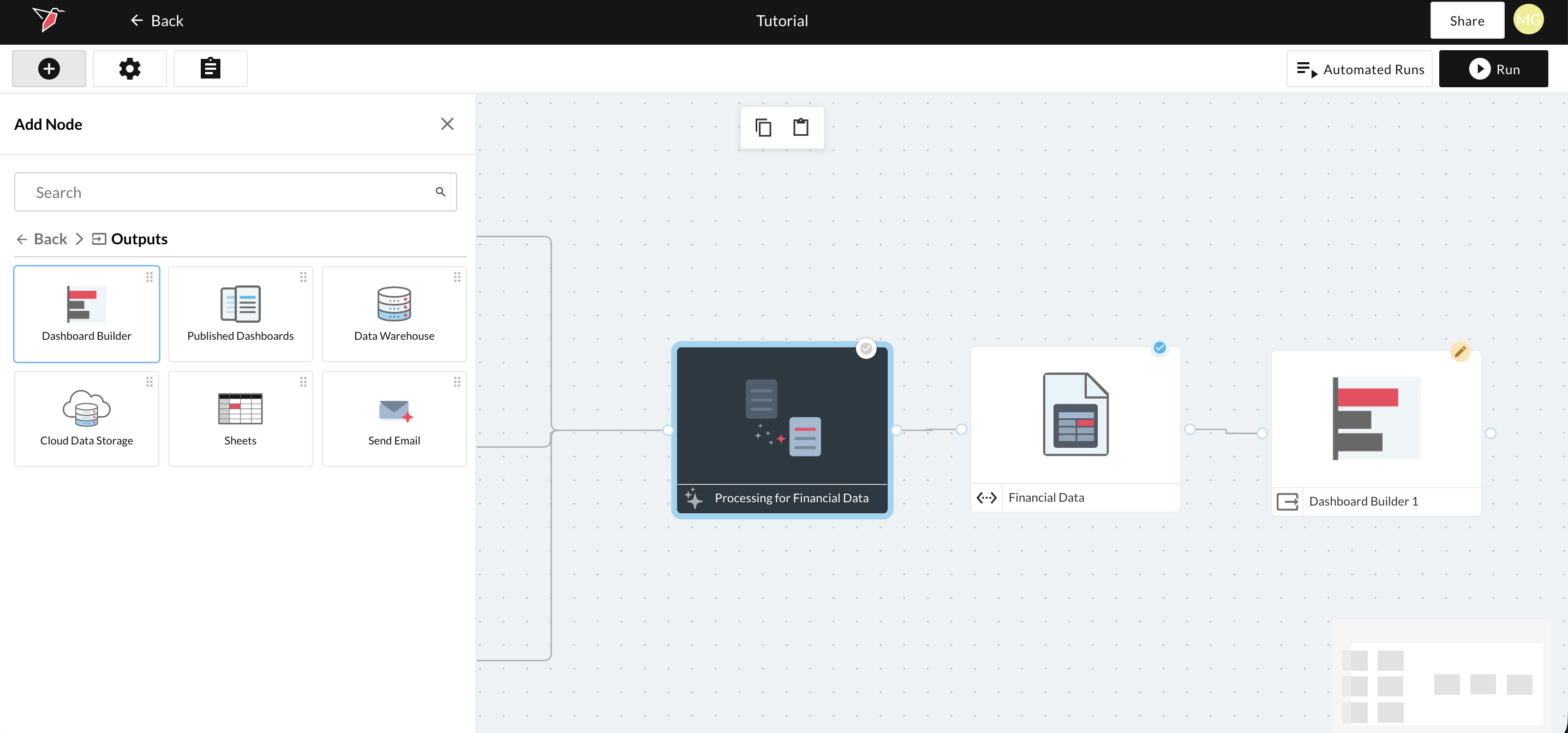 - Open the panel to the left by clicking the plus icon in the top left of your screen. Select Outputs and drag and drop a "Dashboard Builder" node onto the workflow canvas. Connect it to the output dataset produced by the AI DT node: "Financial Data".