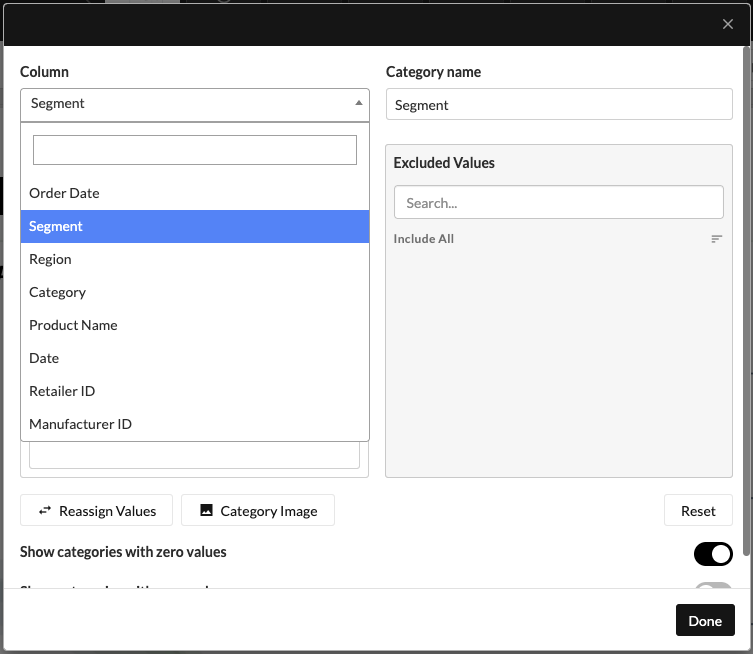 Click Edit on the Category section of the Actions Panel. Choose Segment from the Column Drop-Down - these values will appear across the X axis. Click Done.
