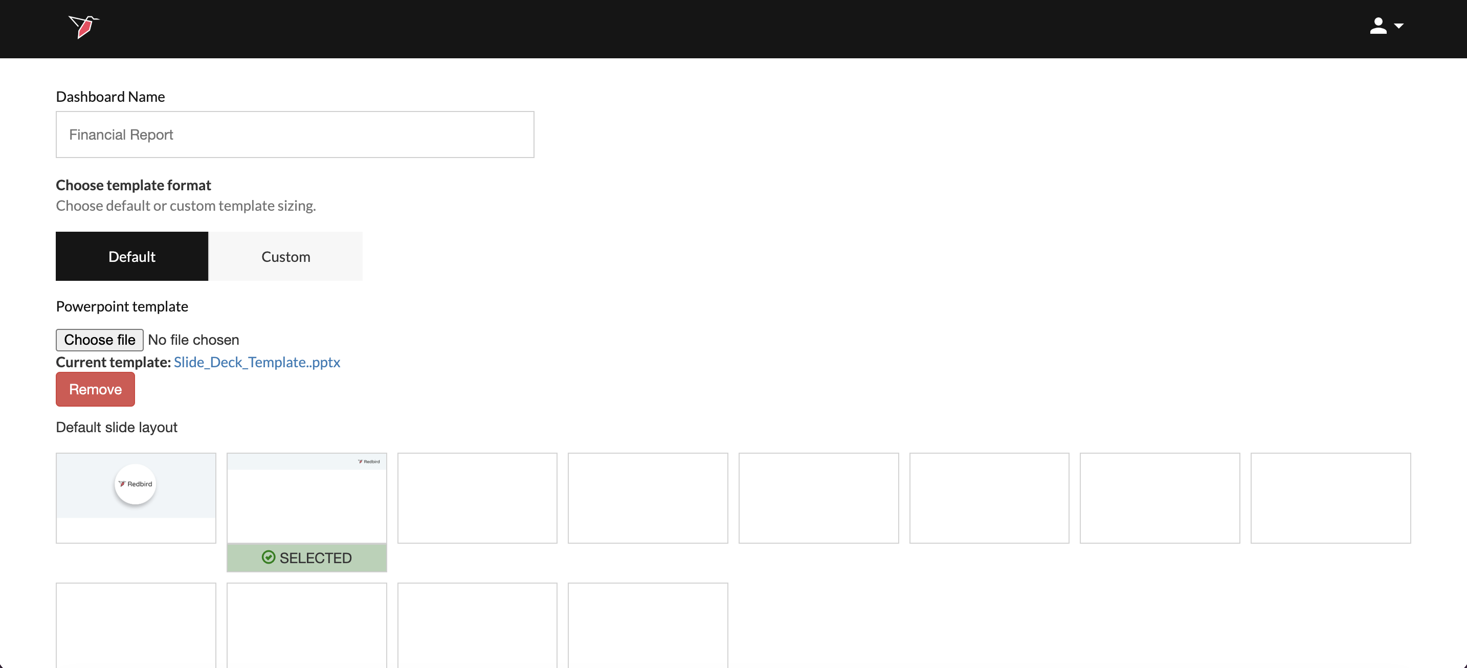 - This will bring you to the dashboard configuration page. Name the dashboard "Financial Report", upload the Template and wait for the thumbnails to generate. Click the second thumbnail with just the header to select it. Then Click Done.