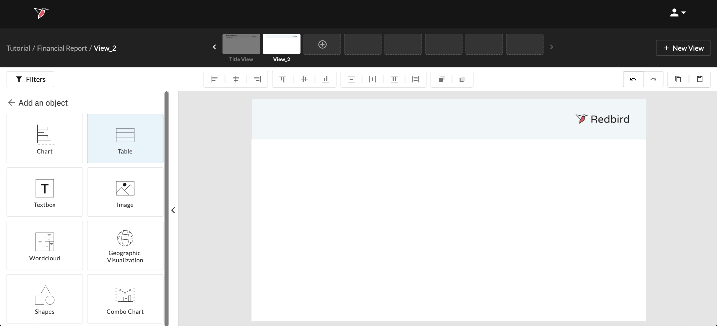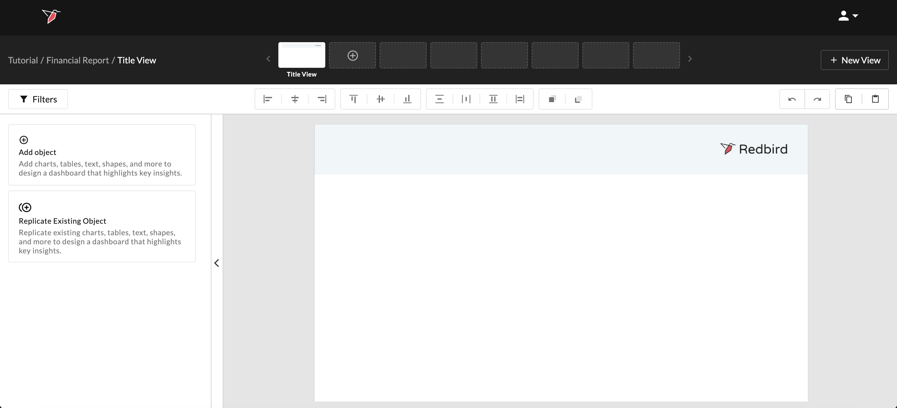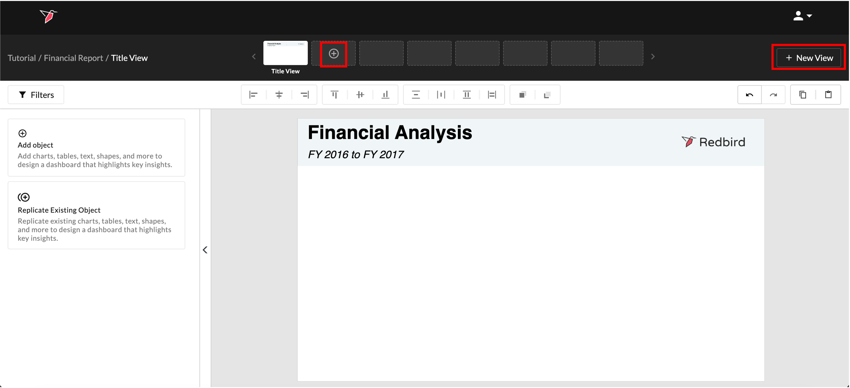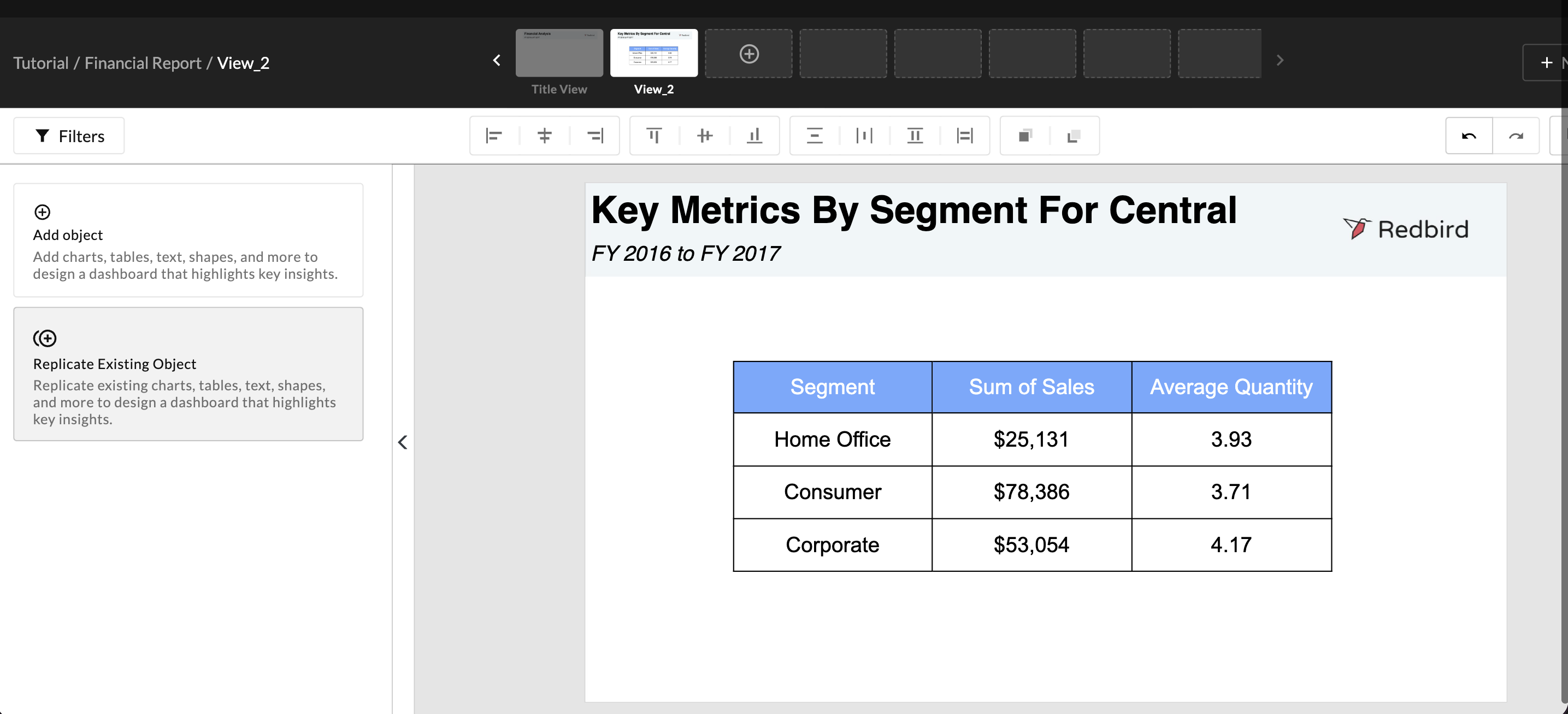 - To reuse the formatting or content from the title view, first make sure the table is not selected—click anywhere else on the view or click X in the Actions Panel. Then, click Replicate Existing Object from the Actions Panel.