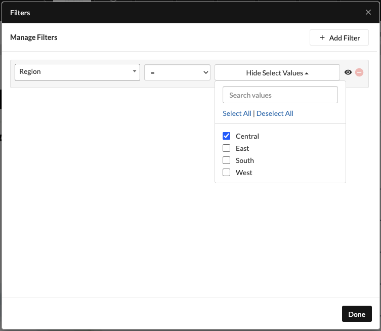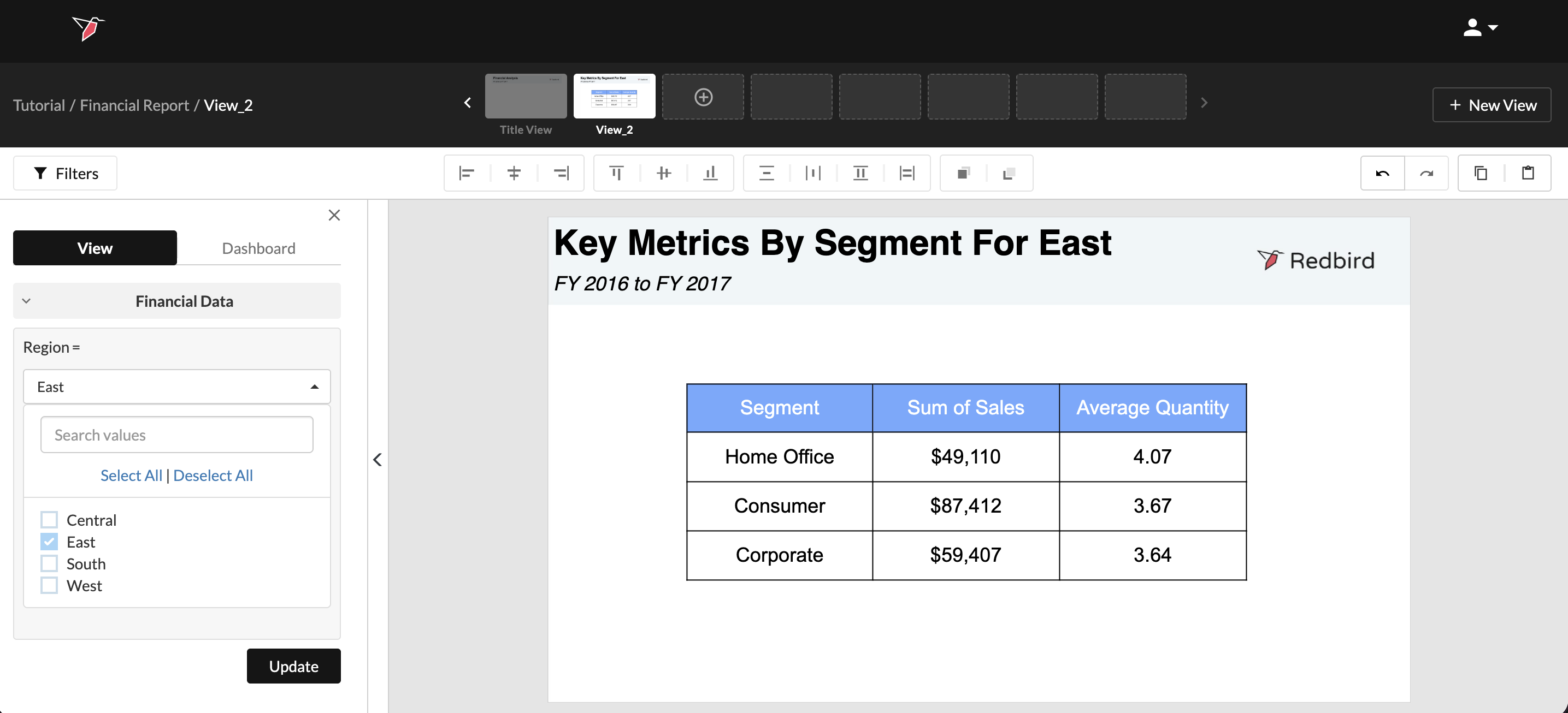 - Select Filters above the Actions Panel, change the filter value from "Central" to "East" and click Update. The data and the headline will update automatically.