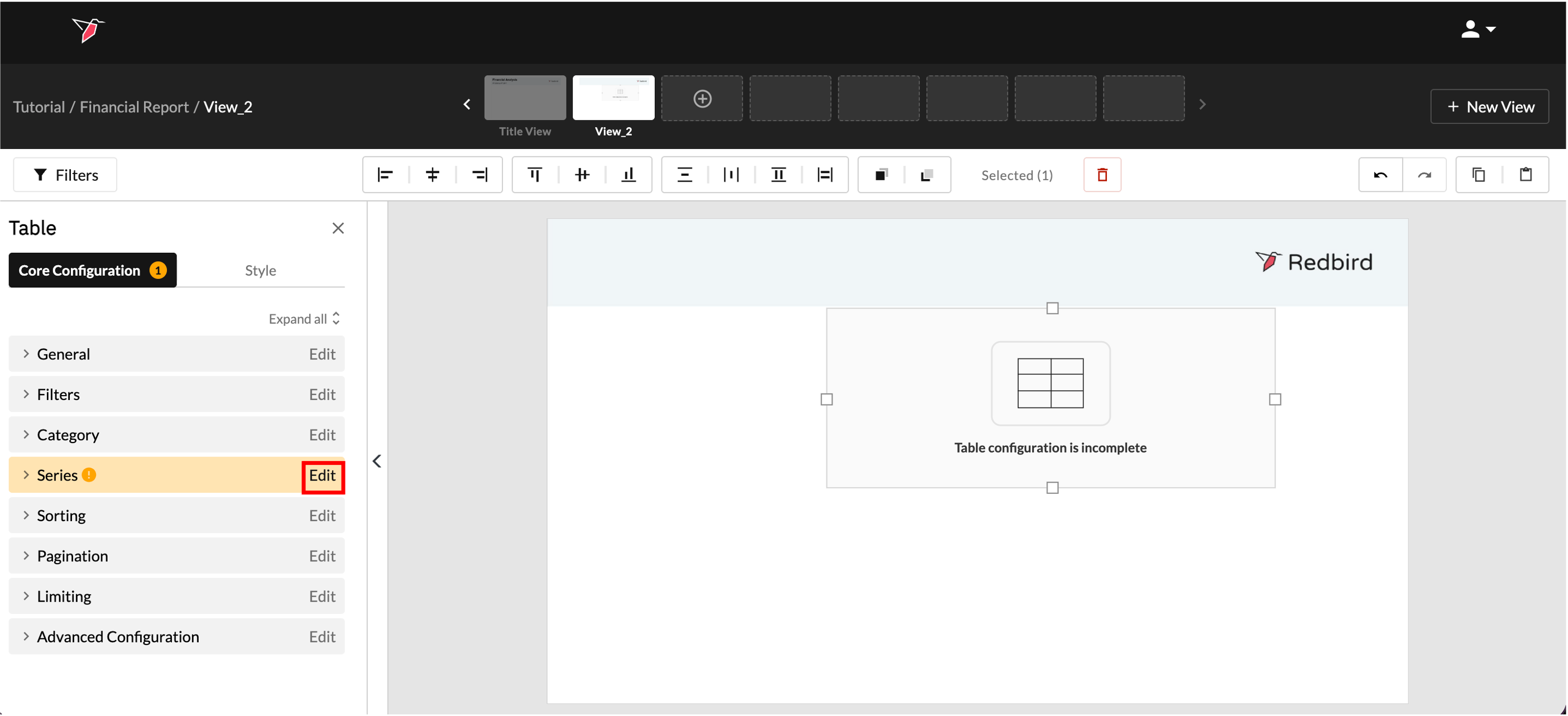 - Click on the table object then click Edit in the Series section of the Action Panel to add a series.