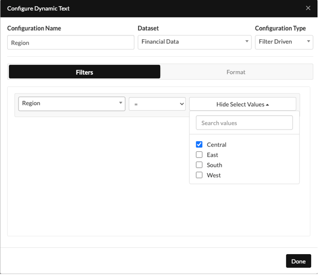 - Name your Dynamic Text Configuration "Region". Select the dataset and toggle the Configuration Type to Filter Driven.