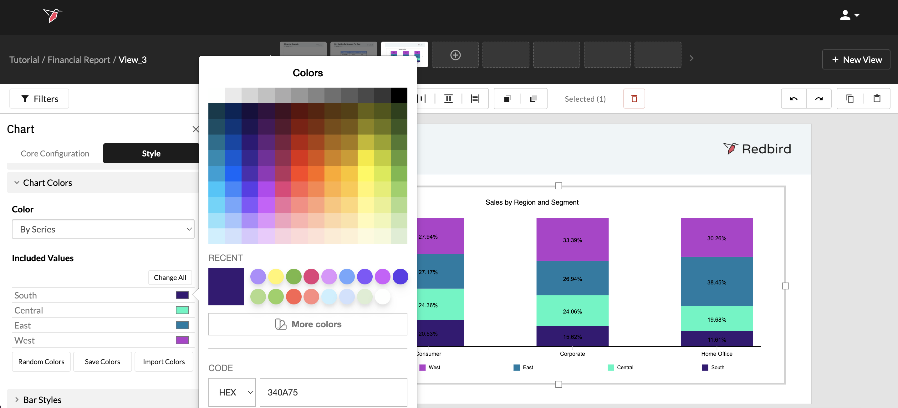 Name your Chart "Sales by Region and Segment", then select Financial Data from the Dataset drop-down.