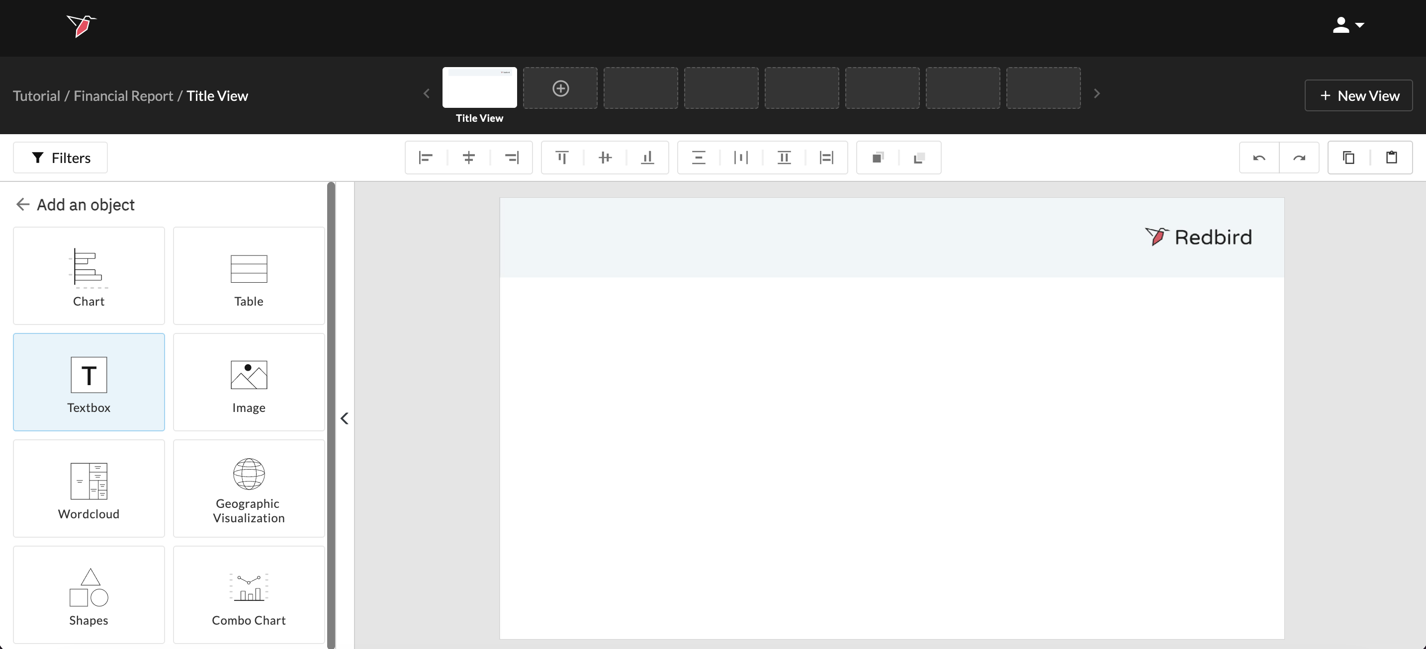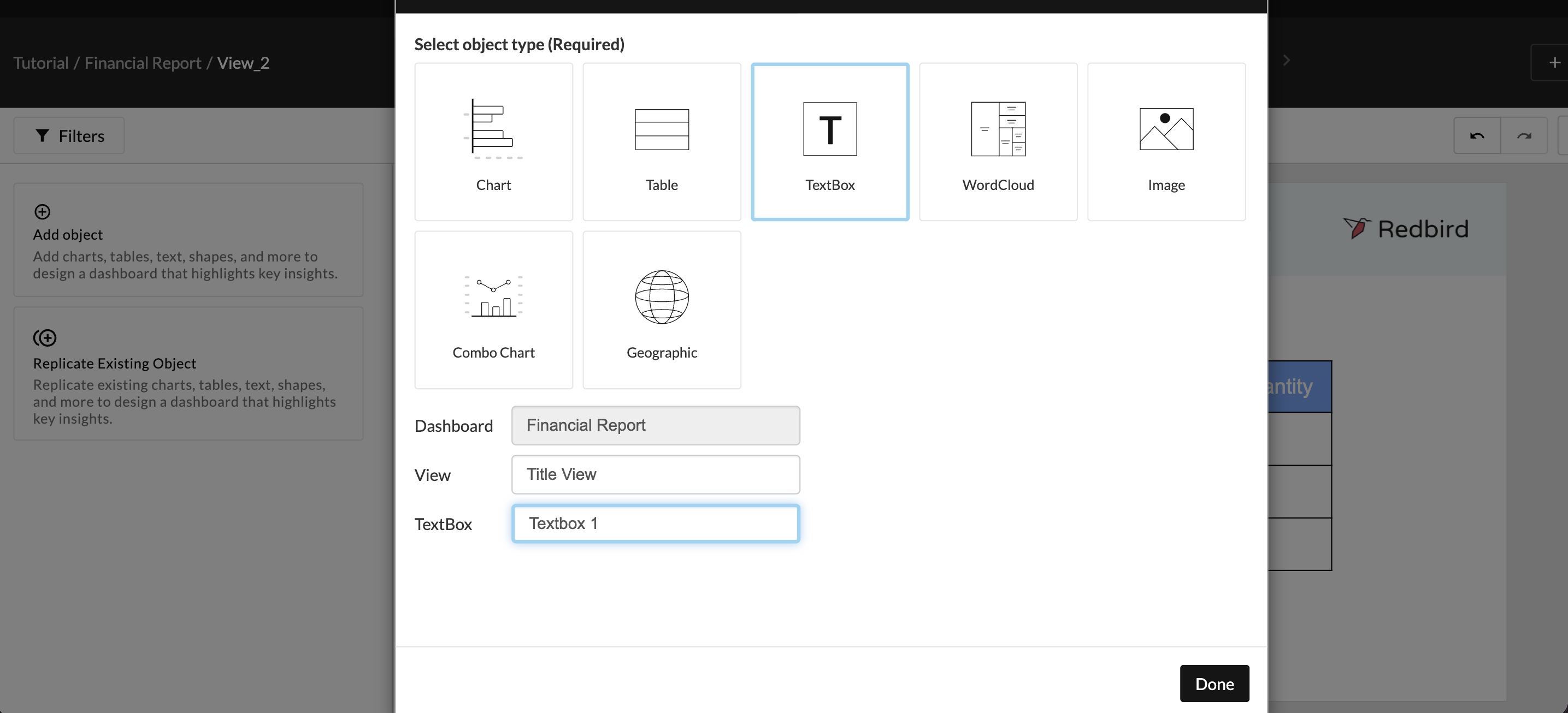 - Add a textbox to give the dashboard a title and add relevant information. Click the Textbox icon in the Add object pane.