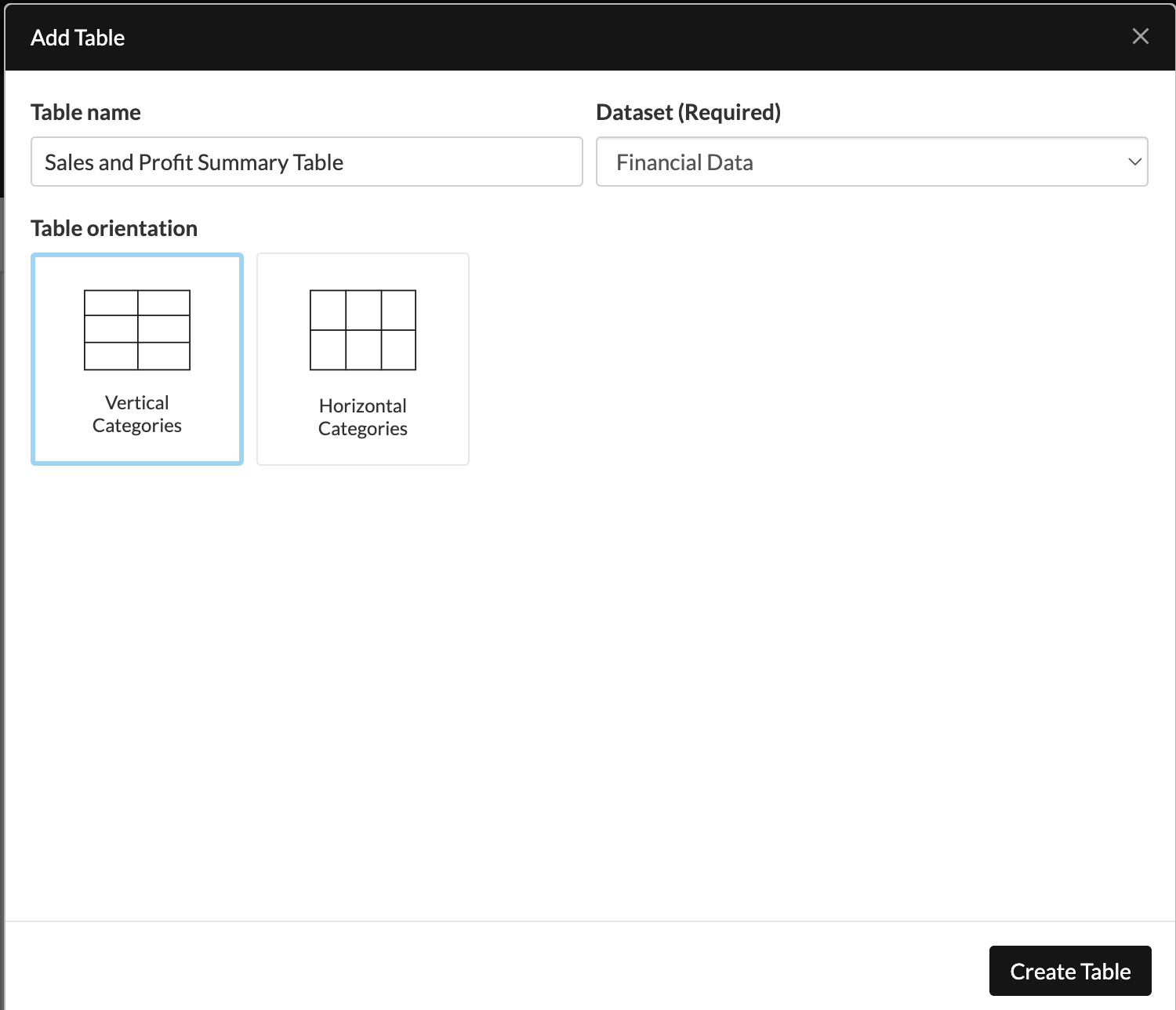 - Name your table "Sales and Profit Summary Table" and select Financial Data as the dataset to connect this object to. Click Vertical Categories, then Create Table.