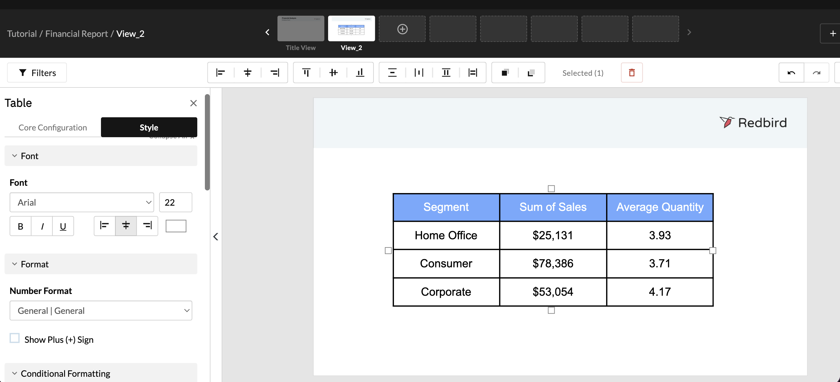 - You can format your table to the desired style using options in the Style pane on the left. For example you can: