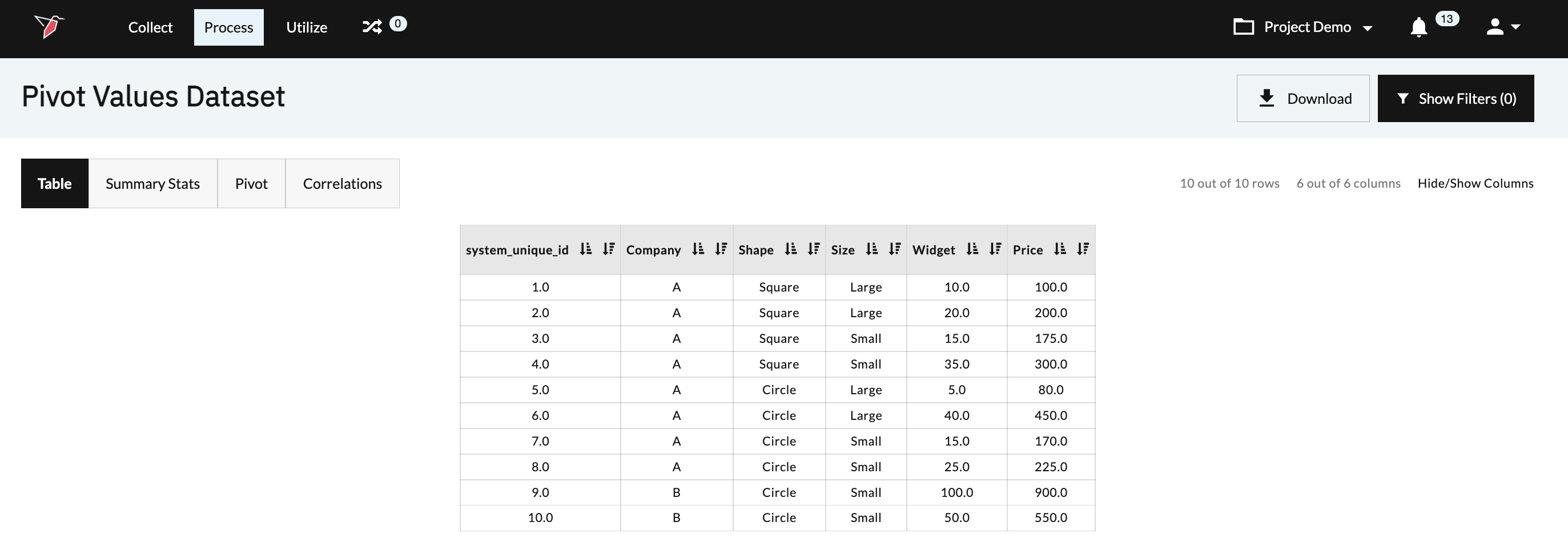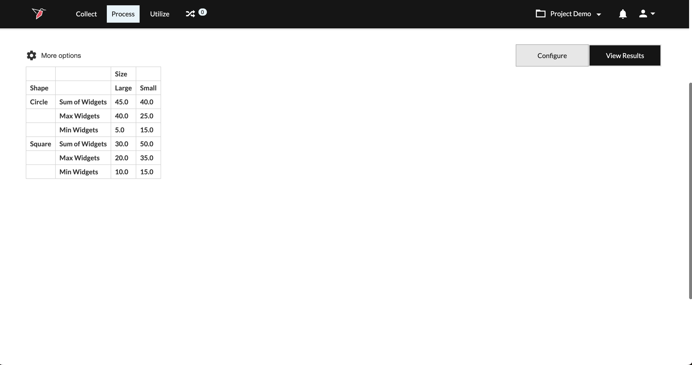 allow you to pick the relevant attributes you want to analyze and view them as either rows or columns. In our example, the dimensions we want to analyze are shape (row) and size (column). - Values: Once you have set up your filters and dimensions, you can determine the values you want returned and the calculations you want to run. The calculations that are available in the Calculate Pivot Values operation include mean, median, mode, max, min, count, percentage count, sum, percentage sum, quartile, percentile, and standard deviation. In our example, we want to sum the number of widgets.