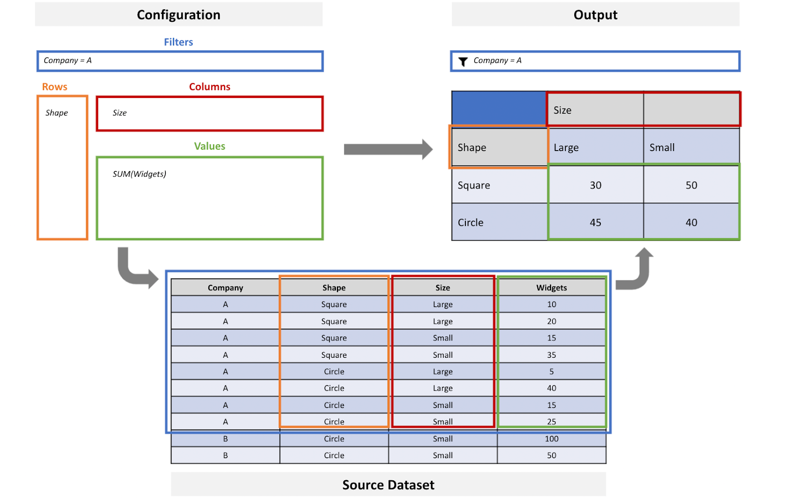 The below diagram highlights how our filters, dimensions, and values come together to help us determine how many widgets of each shape and size combination were produced by company A.