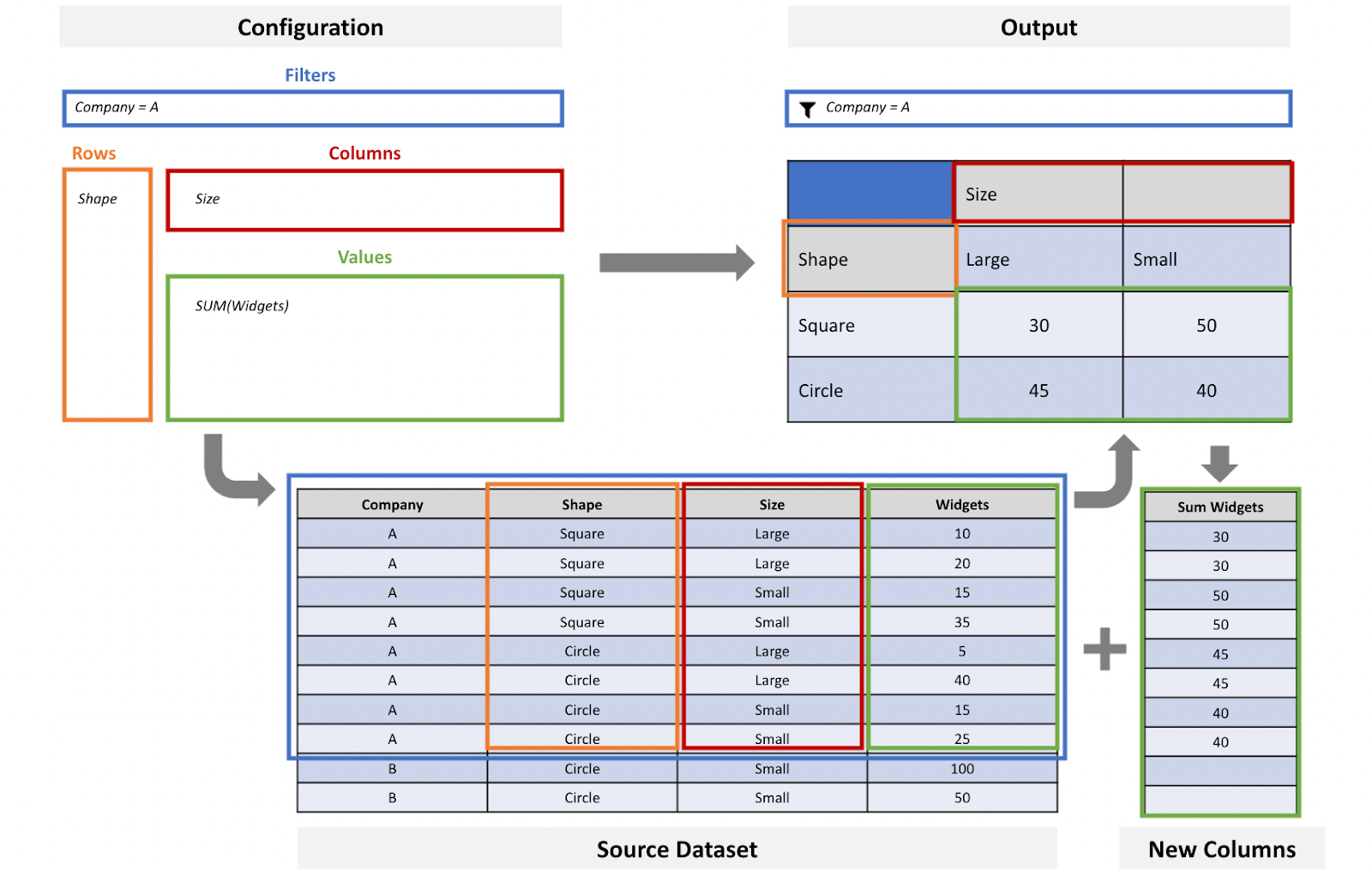 As industry analysts, we are interested in understanding how many widgets of each size and shape combination company A produced. To complete our analysis, we are going to use the Macro Builder and Calculate Pivot Values operation. The Calculate Pivot Values operation is configured using three main inputs - filter, dimension(s), and values.