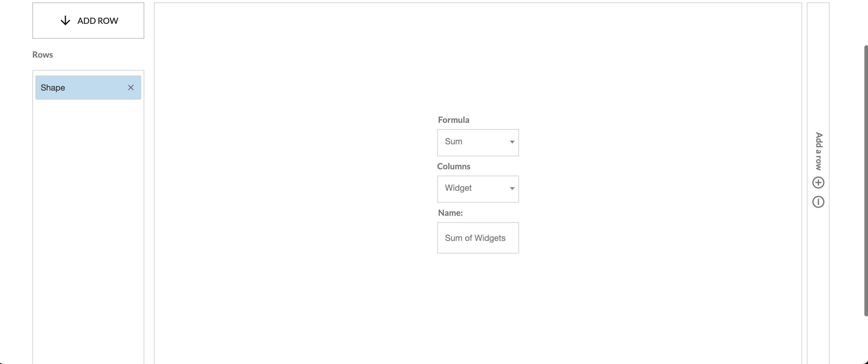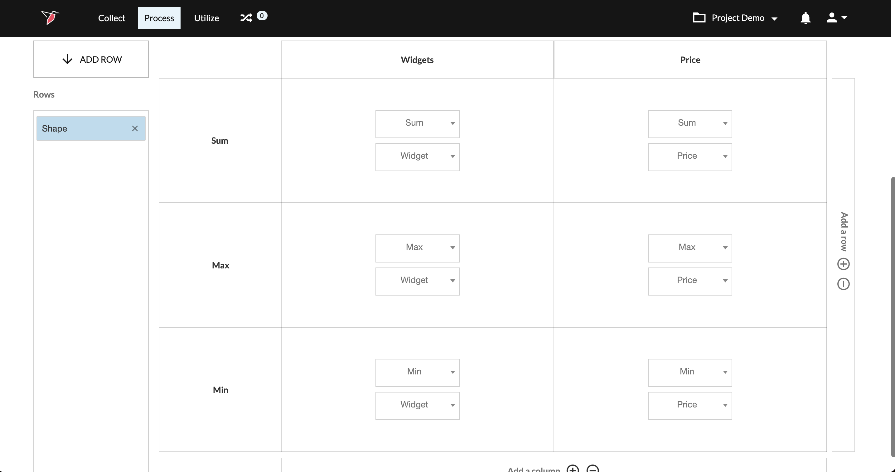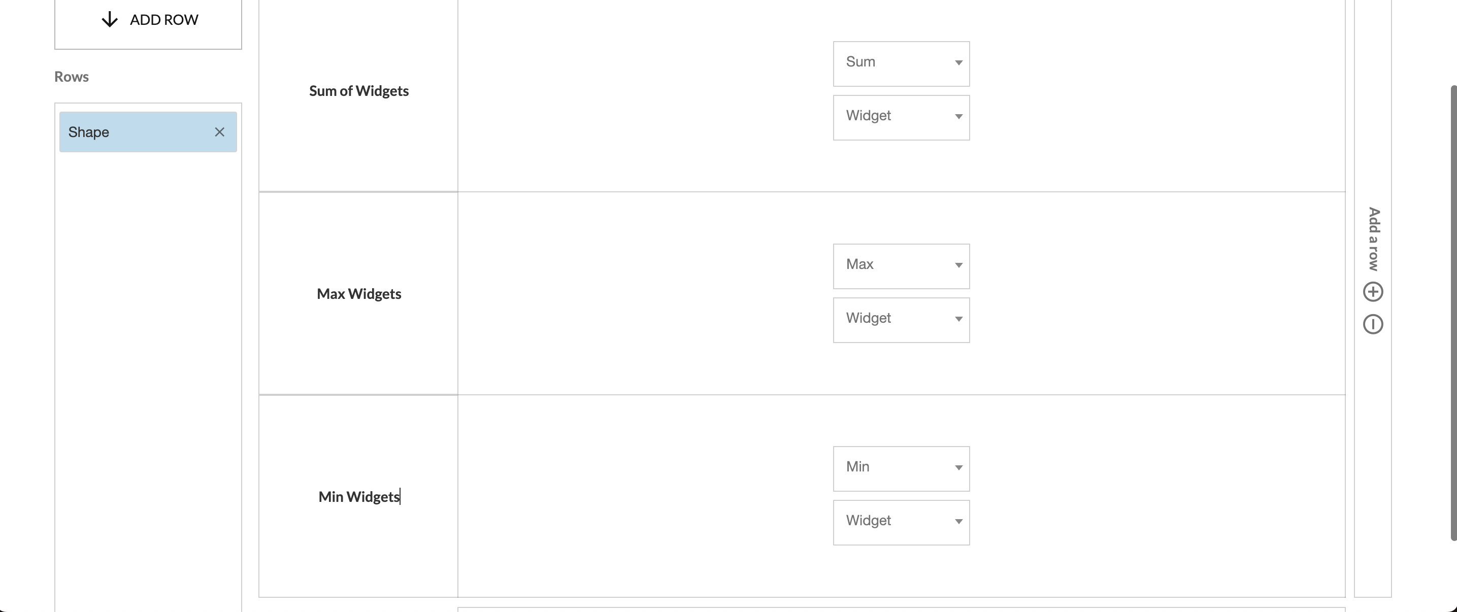- Add additional value calculations to analyze different metrics across your dimensions by using the +/- buttons located on the right and bottom edges of the values area. For example, we may want to expand our analysis to not only look at the sum of widgets by shape/size but also the max and min number of widgets by shape/size. The below screenshots highlight how you can configure multiple values to generate useful insights.