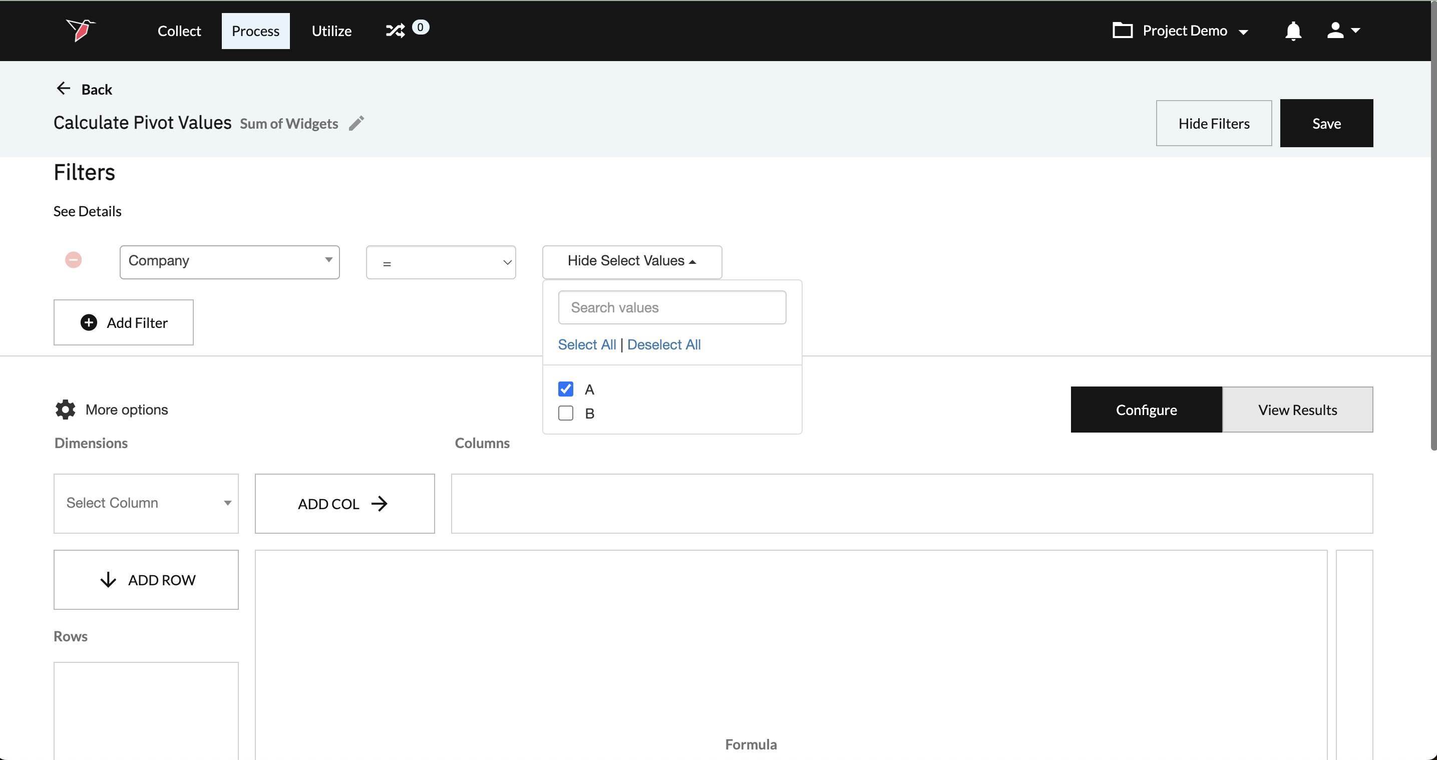 To configure the Calculate Pivot Values operation, we are going to use the example from the “How it Works” section. As we discussed earlier in the document, we are interested in understanding how many widgets of each size and shape combination company A produced. To accomplish our task we are going to set our filters, dimensions, and values.