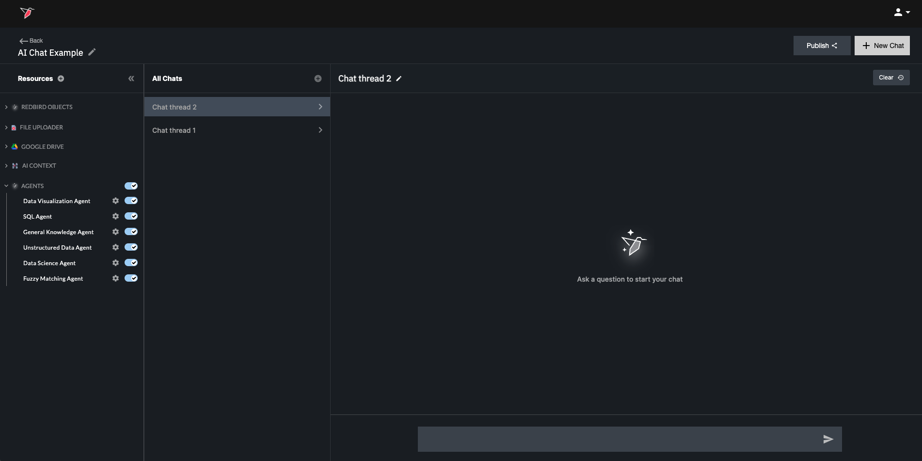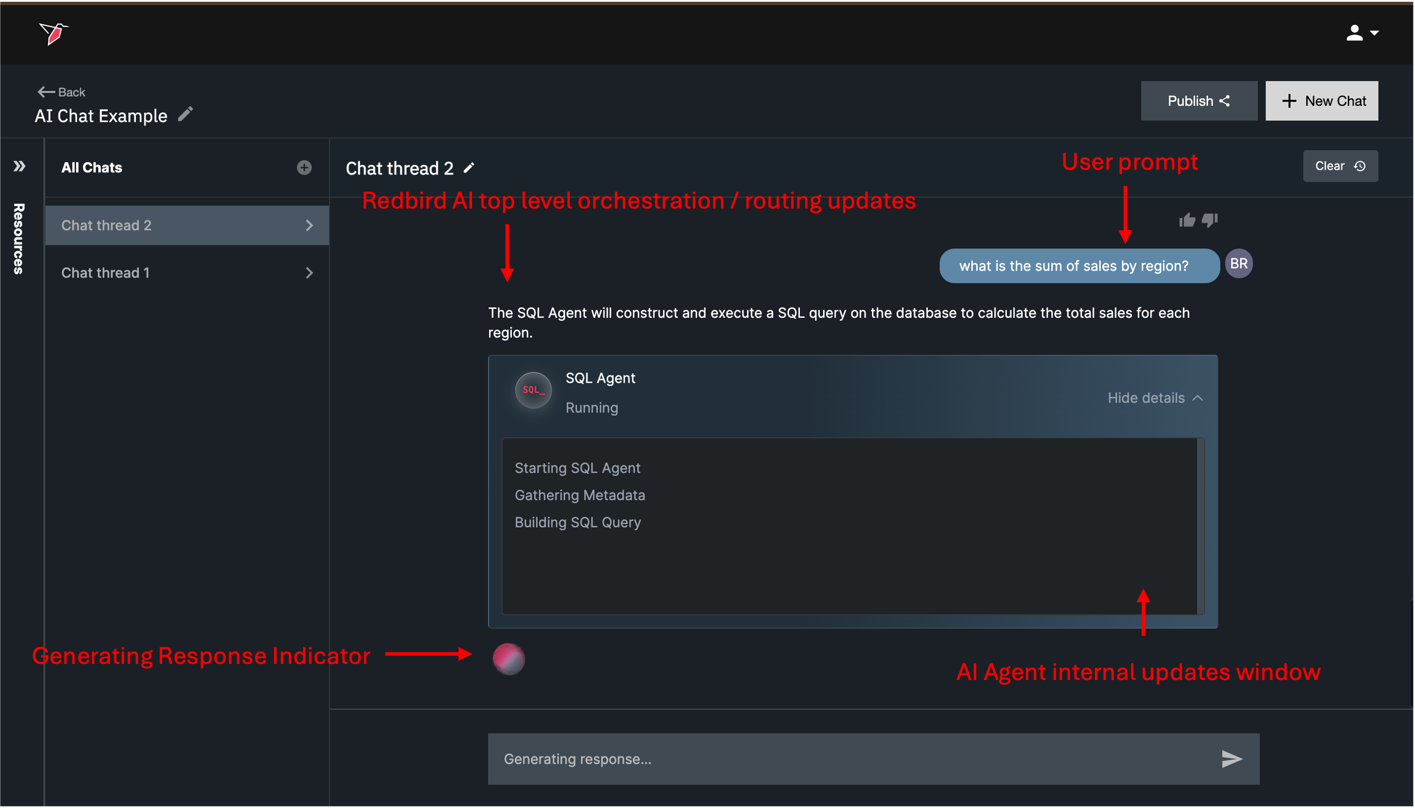 - Each AI agent recruited by Redbird AI's top level router will show up in the chat thread as a separate update window