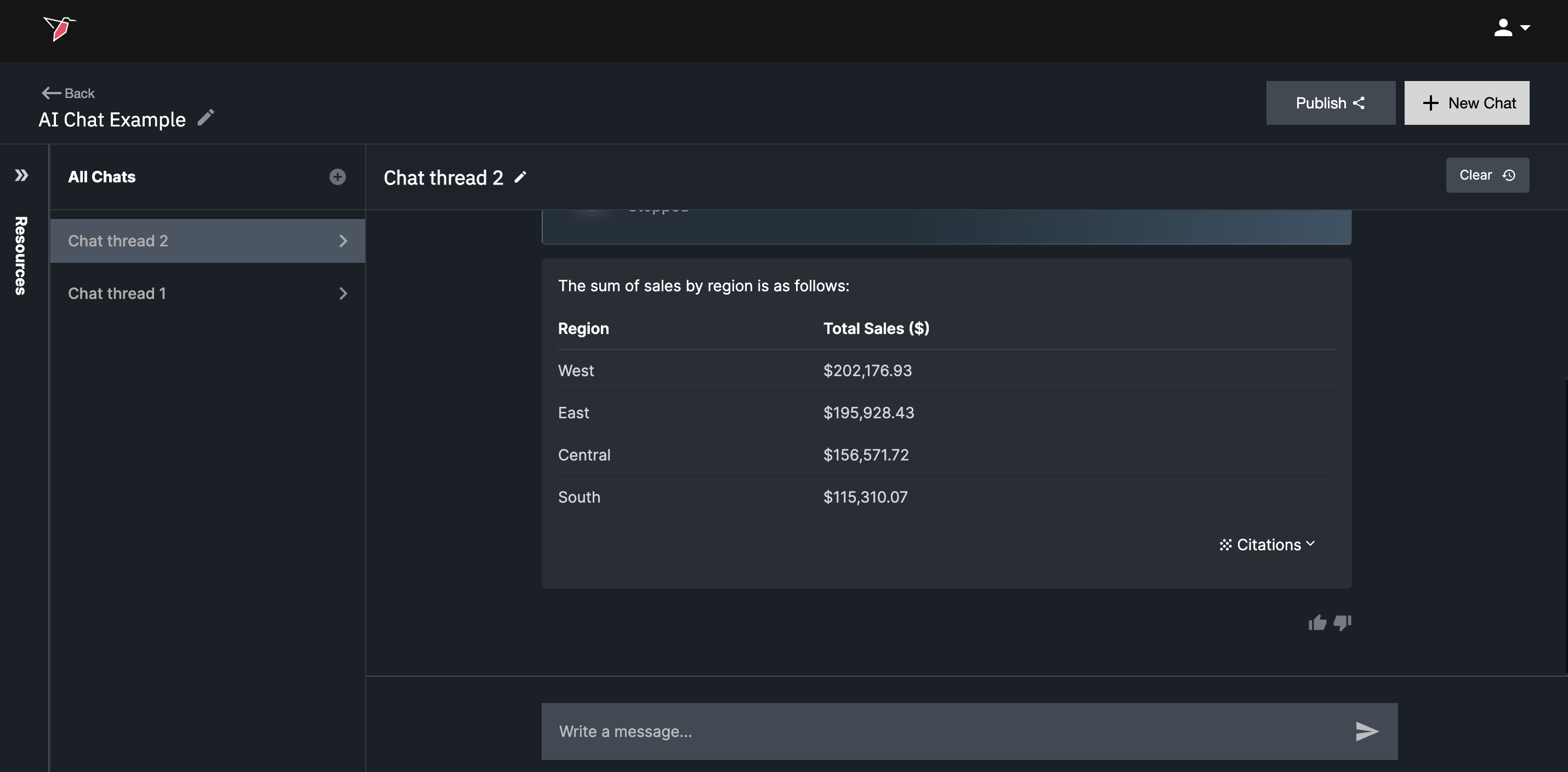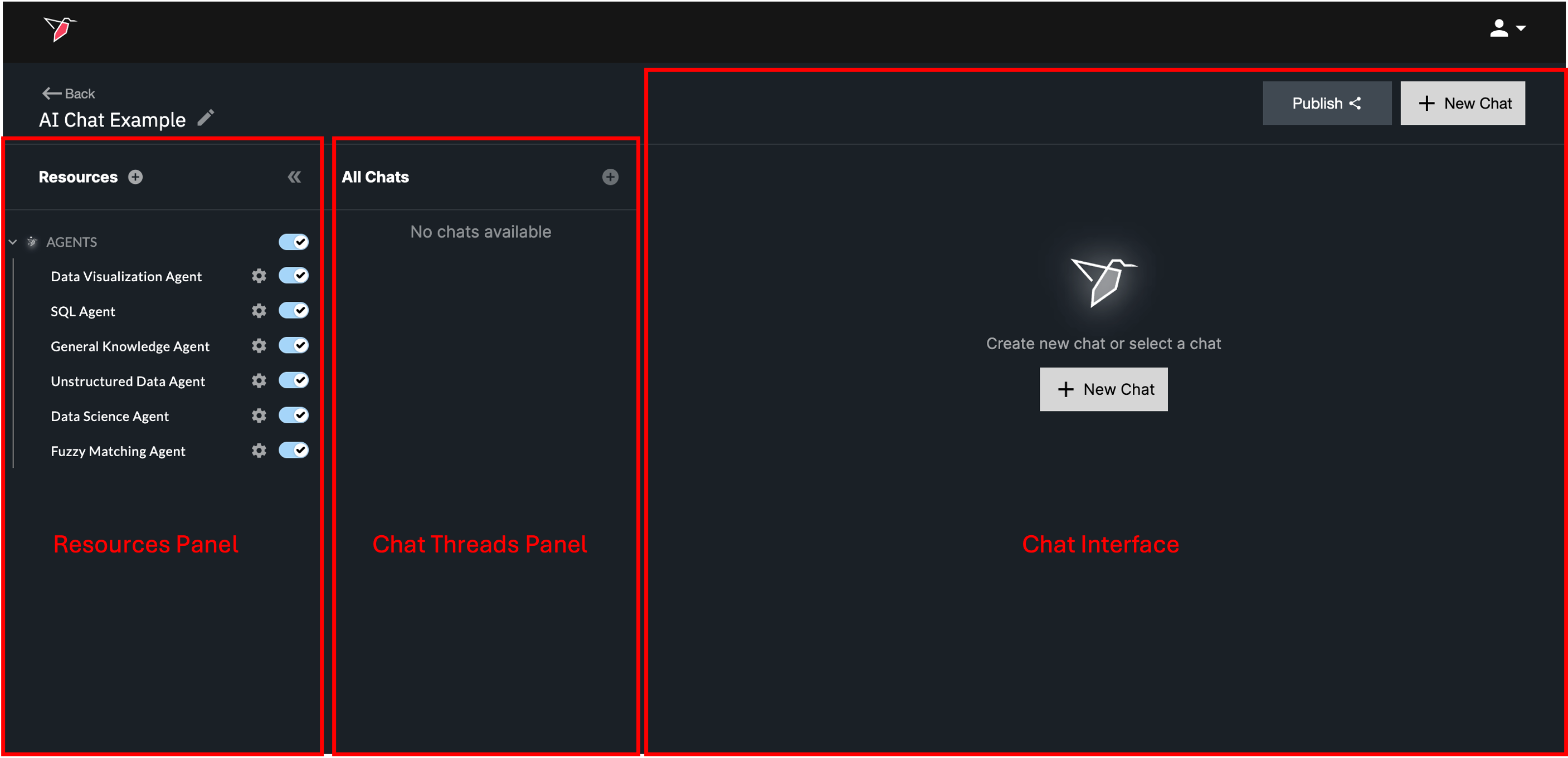 The AI Chat node experience is made up of three main sections, which are highlighted in the image below and described in more detail in the following sections below: the Resources Panel, Chat Threads Panel, and Chat Interface.