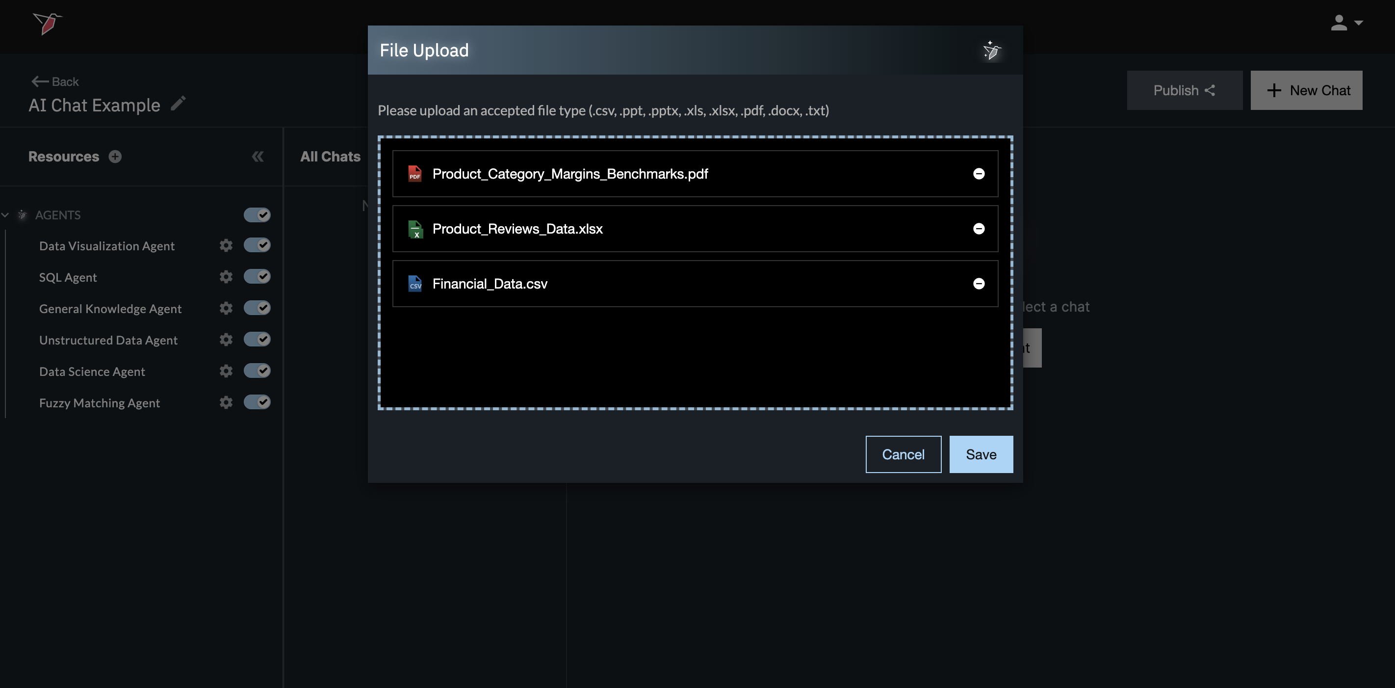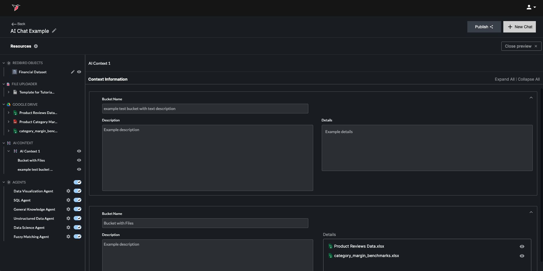 For the AI Chat to operate on data (with some exceptions such as general knowledge agent), you must provide one or more resources. You can do this in two ways: