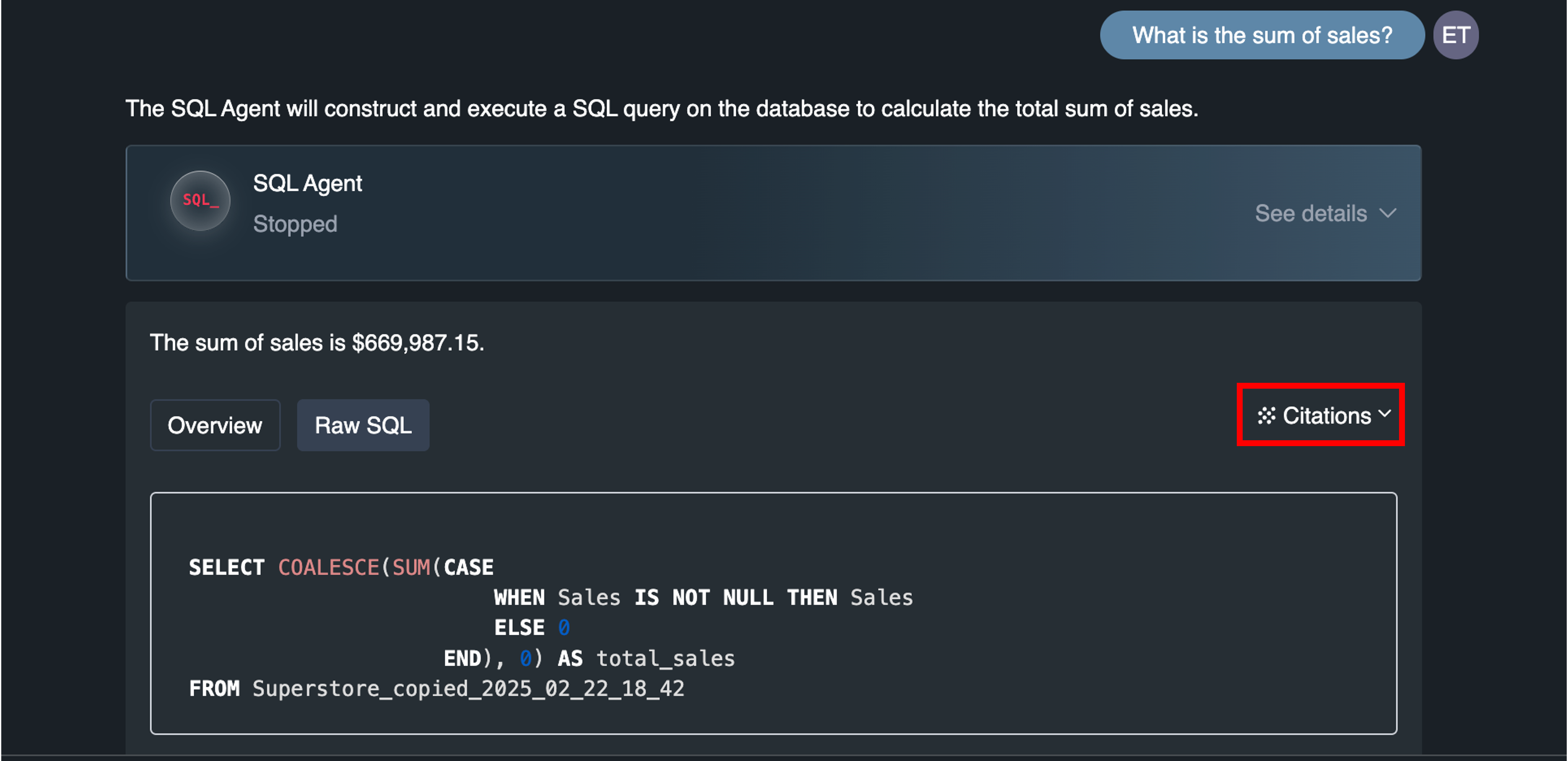- Citations are typically informational and give the user more details on the AI logic inline in the chat thread (e.g. queries / code snippets executed by the AI or reference to specific data sources / documents used to answer the question). You can expand and view citations by clicking on the 'Citations' action on the bottom right of the AI response. If an AI context node was connected to the chat and that context was used to respond to a question, that will also be included in citations.