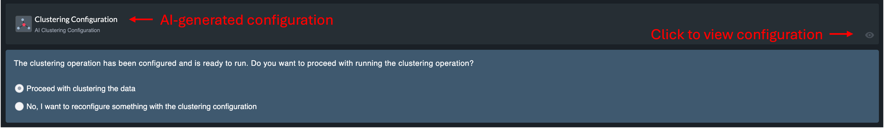 - Configurations provide visibility into more involved operations within the AI's workflow. You can click through to see the configuration details in a new tab by clicking on the eye icon next to a configuration. Within the configuration details tab that opens up you can also modify the configuration through the point-and-click interface then save your changes. When you return to the chat your saved changes will now be used by the AI from that point forward when executing the operation.