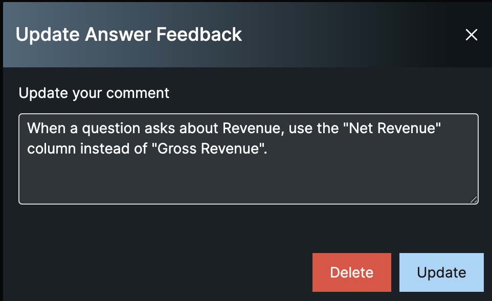 - If you click the thumbs down again, you will have the option to review and edit your existing feedback. Click Update again to save changes or Delete to remove the feedback entirely. Click the X to cancel and exit without making any edits changes.