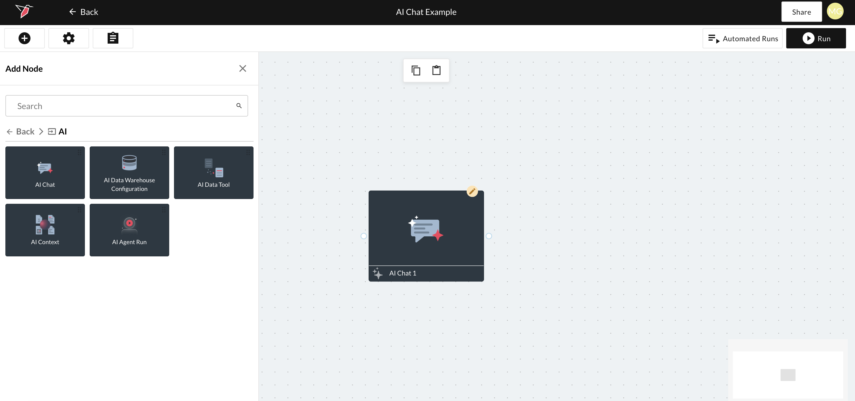 - Add an AI Chat node to the canvas by clicking the Add Objects (+) icon, selecting AI, and dragging the AI Chat node onto the canvas.
