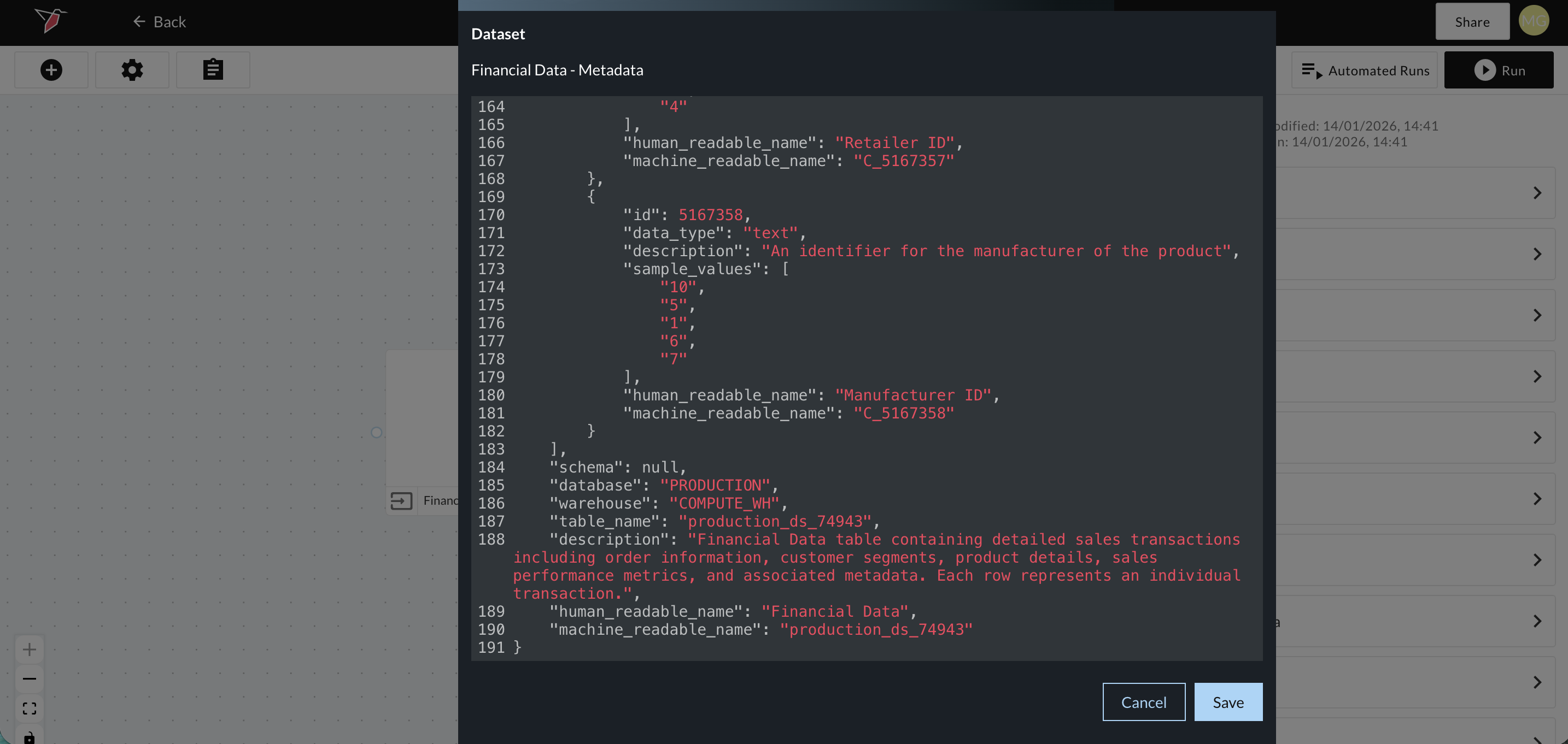 A modal will appear displaying the metadata in JSON format. You may edit any of the fields highlighted in red if needed, then save your changes. Be sure that any edits continue to adhere to valid JSON formatting.