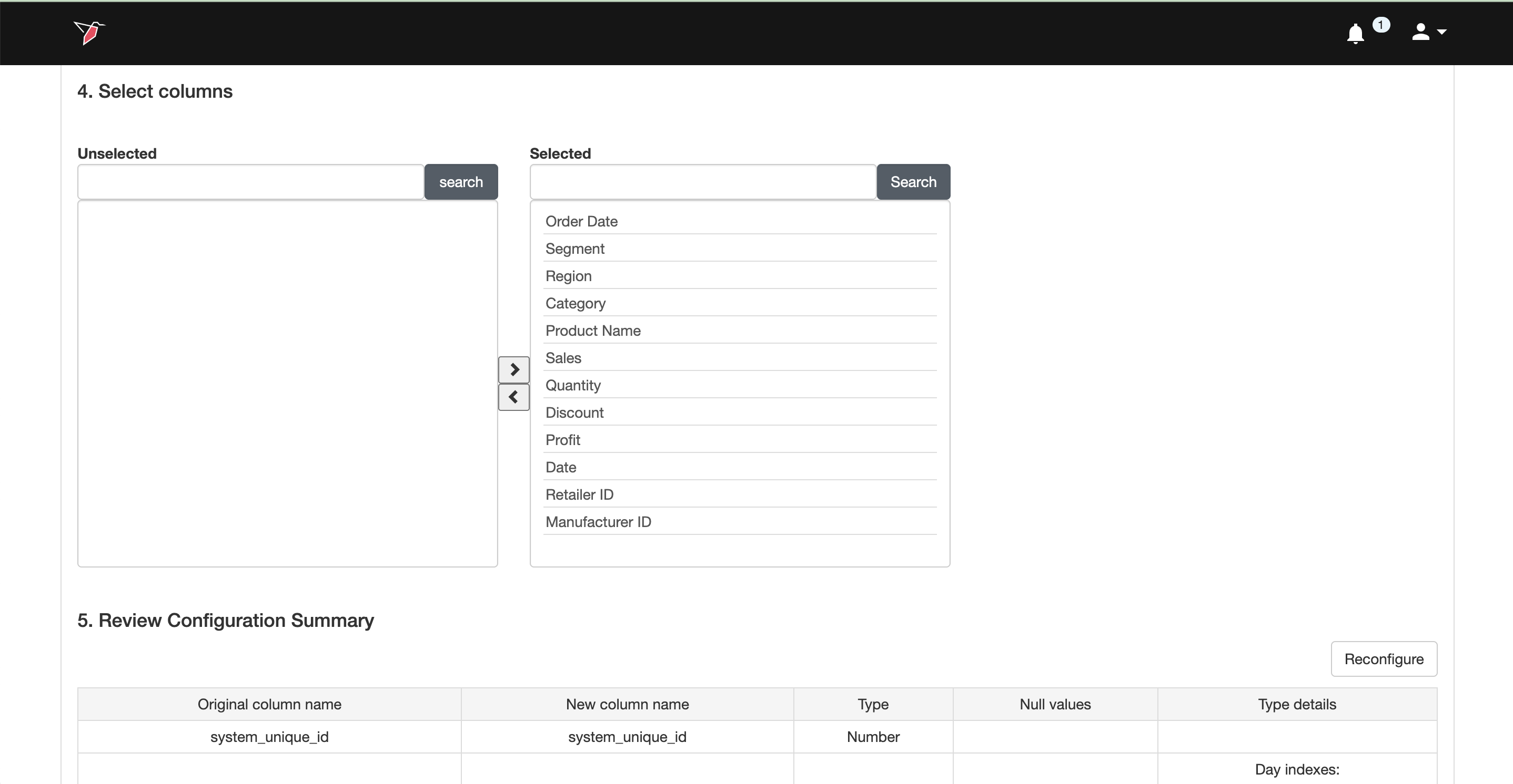 - Review and edit the configuration - The Review Configuration Summary section displays how the columns are currently configured. If you need to make changes (for example, renaming a column or adjusting a data type), click Reconfigure and follow the steps to update the setup.