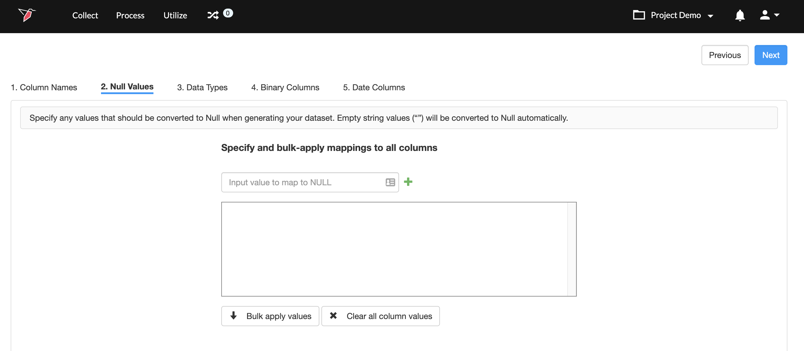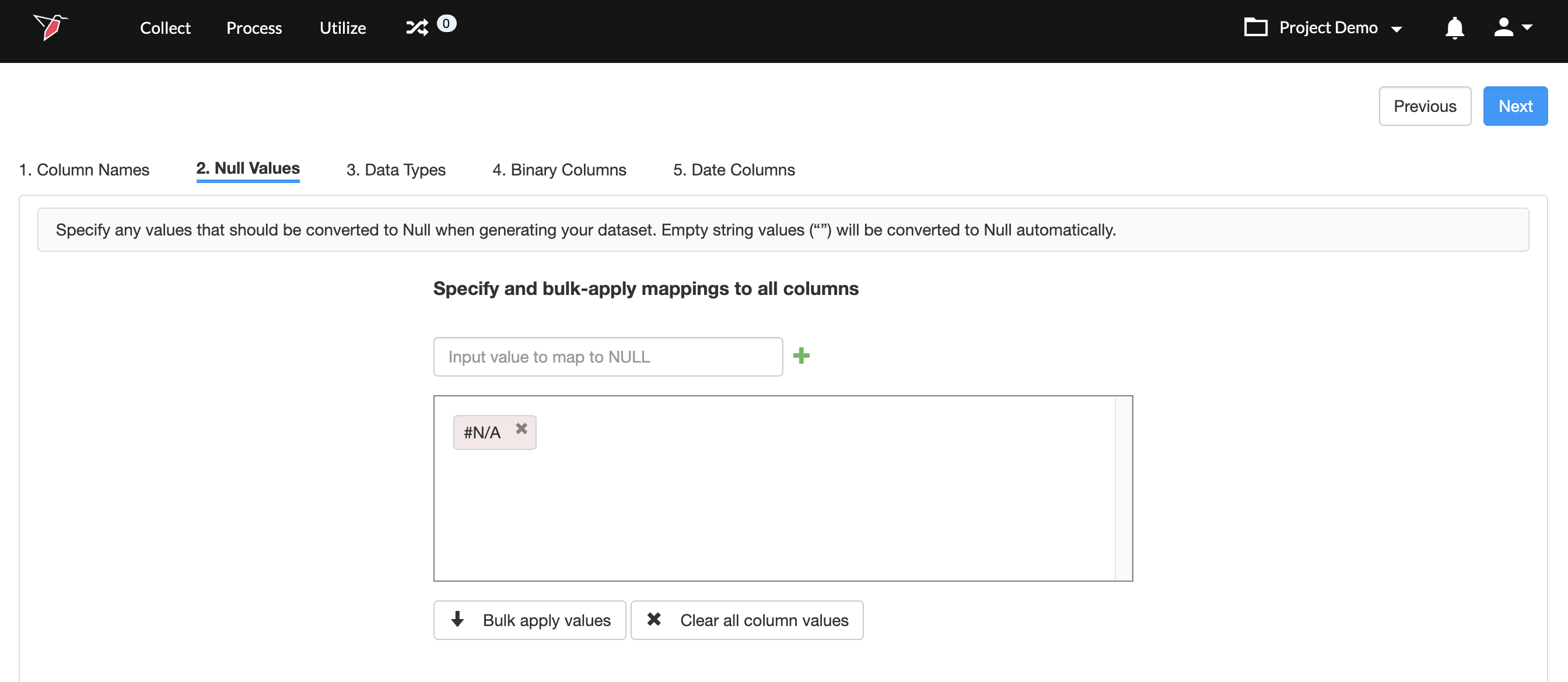 - Once you have added all the values, click Bulk apply values. This will take the values you added in step 2, and apply to all columns in the dataset.