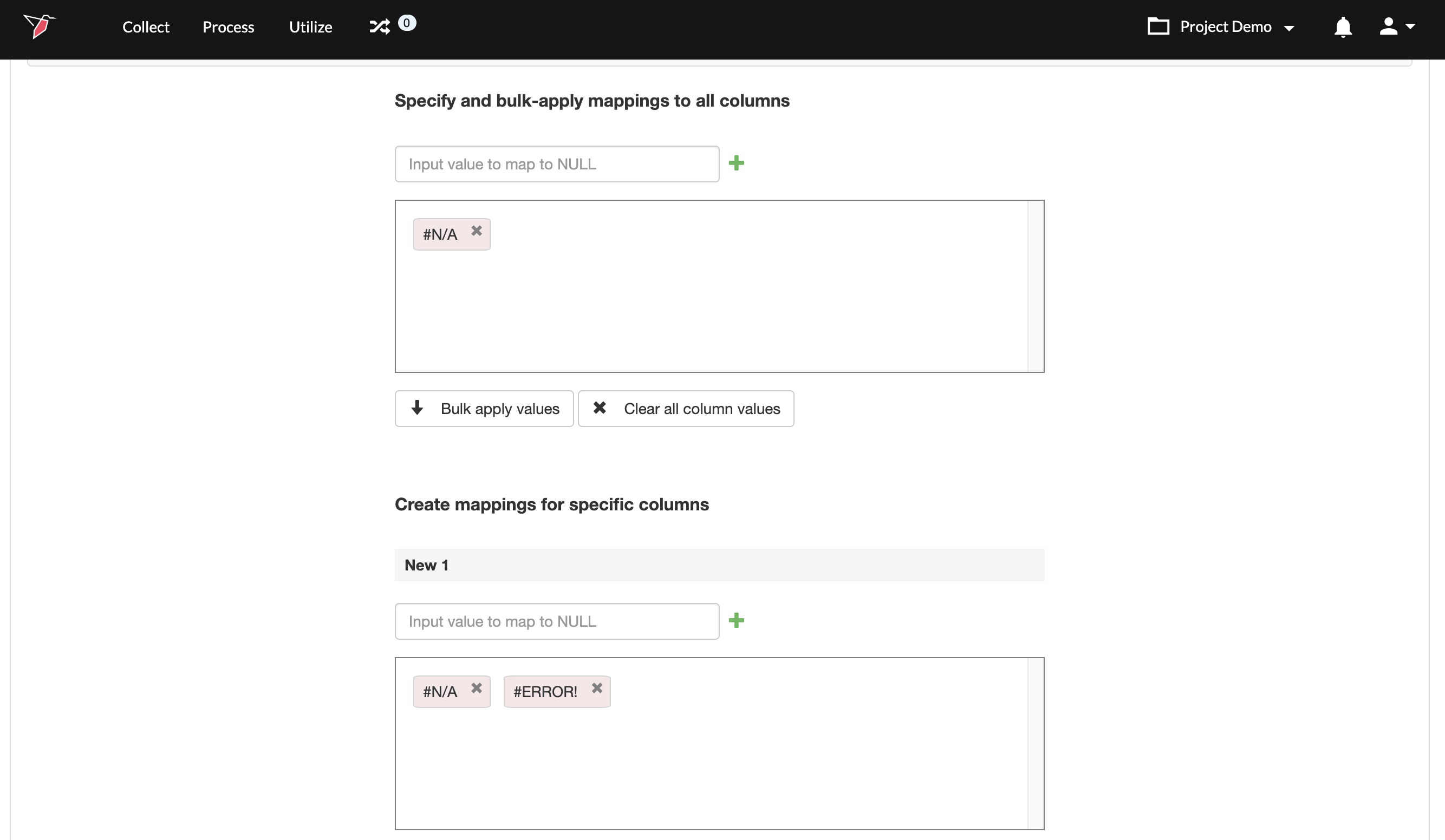 - In the Bulk Mapping Values section, enter a value in the Input value to map to NULL field. For example, #N/A.