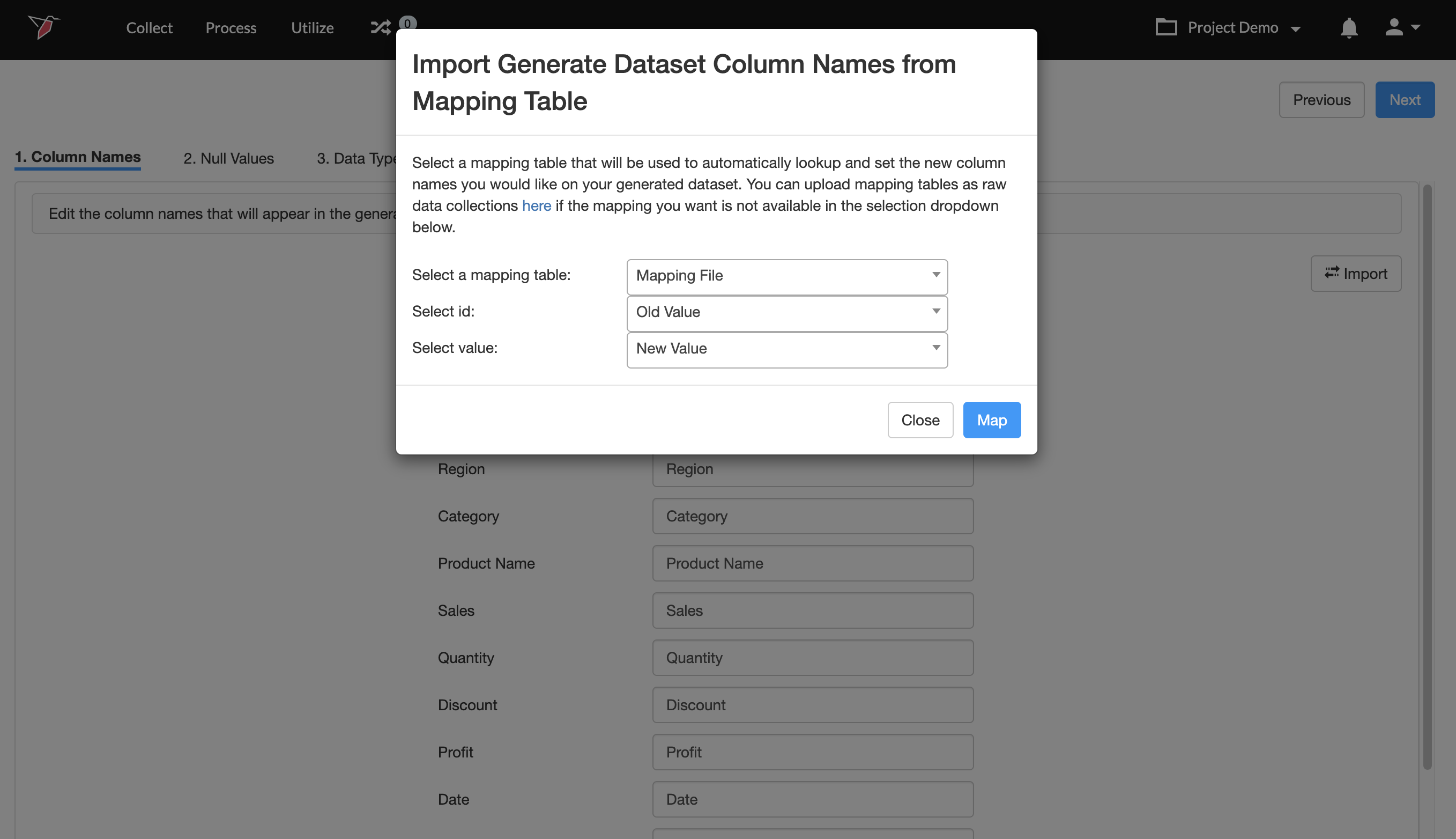 The Collection may have certain values that you would want to consider as null or blank values. You can easily map those values to Null in this step.