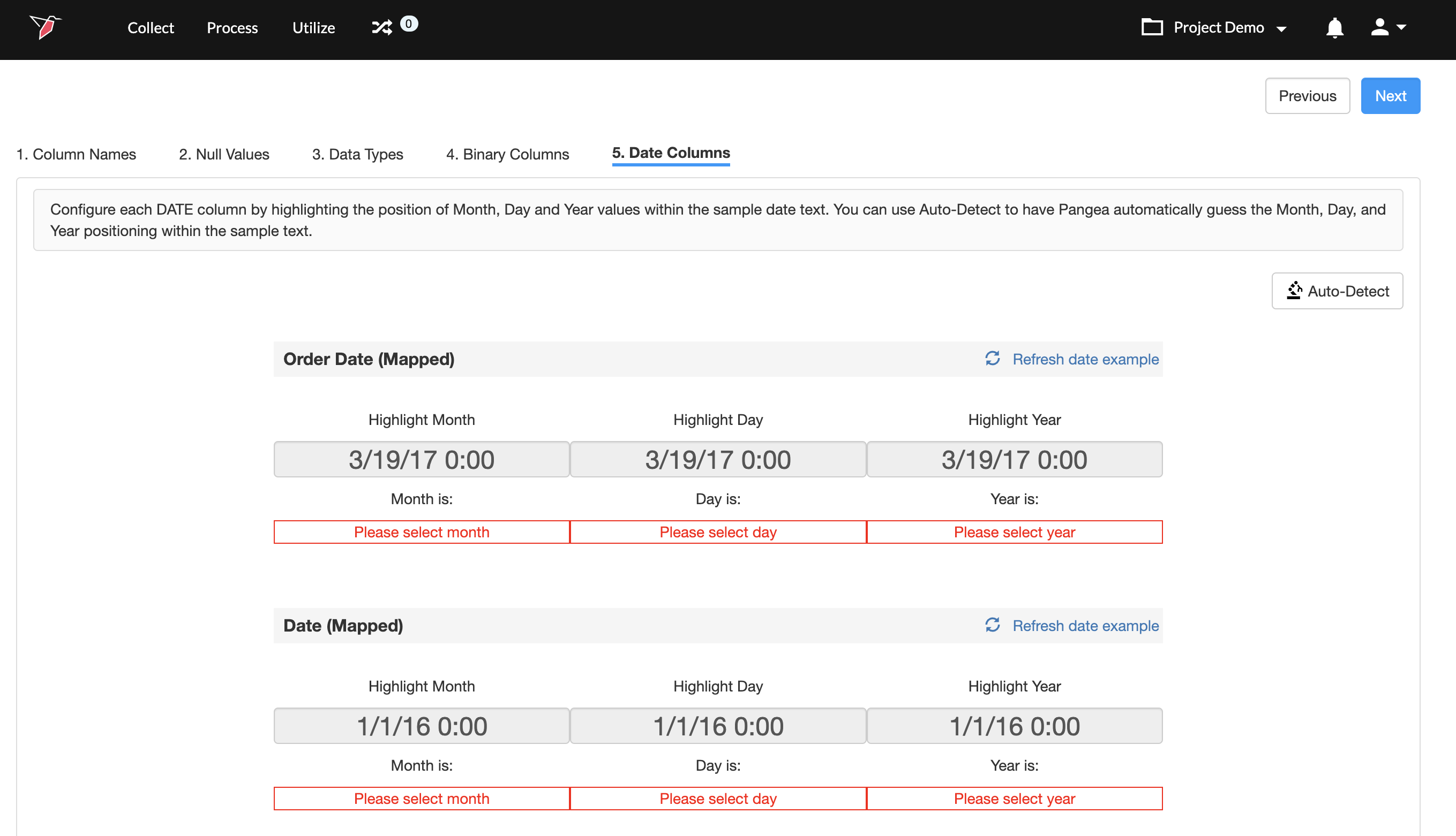 If any columns were assigned to the date data type, you will be taken to this step. To reconfigure date values or configure date values for any newly added columns:
