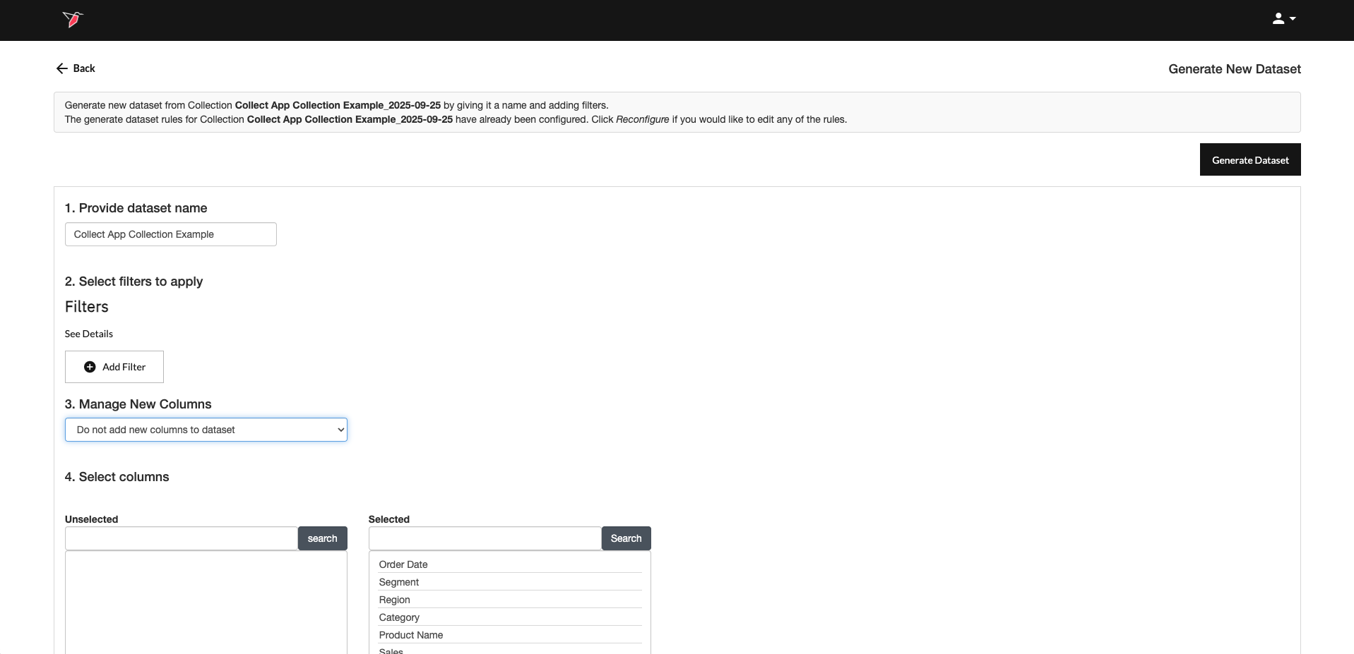 - Select the columns that you wish to be included/excluded in the dataset