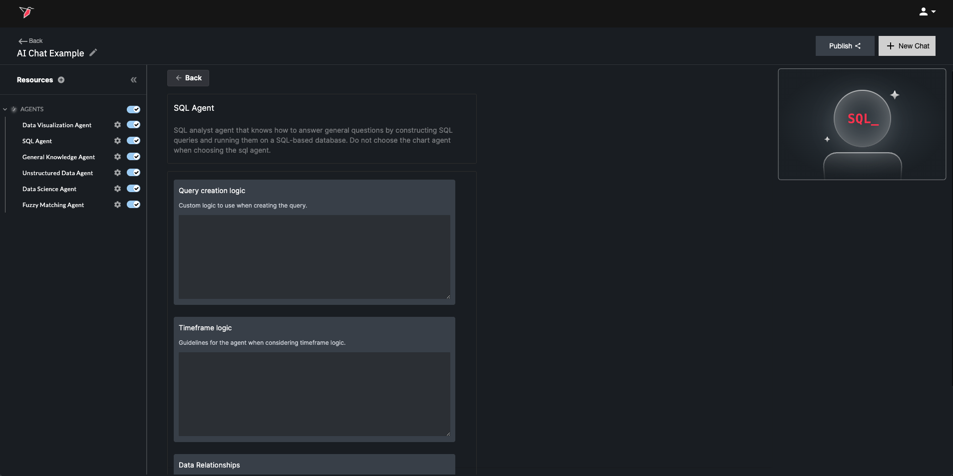 With AI Chat you have access to specific agents. Depending on the base agent you select, there may be parts of the AI agent's logic that will be exposed for you to customize using natural language descriptions of the logic you would like to add.