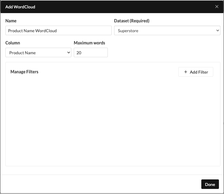 - Configure your WordCloud by selecting the column to use and setting the maximum number of words to display. Optional filters can be added using the Add Filter button. When you’re done, click Done to generate the WordCloud.\