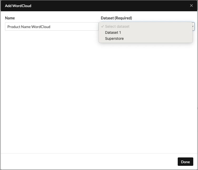 - Name your WordCloud and select the dataset you want to use to generate your WordCloud from within the Dataset dropdown field.