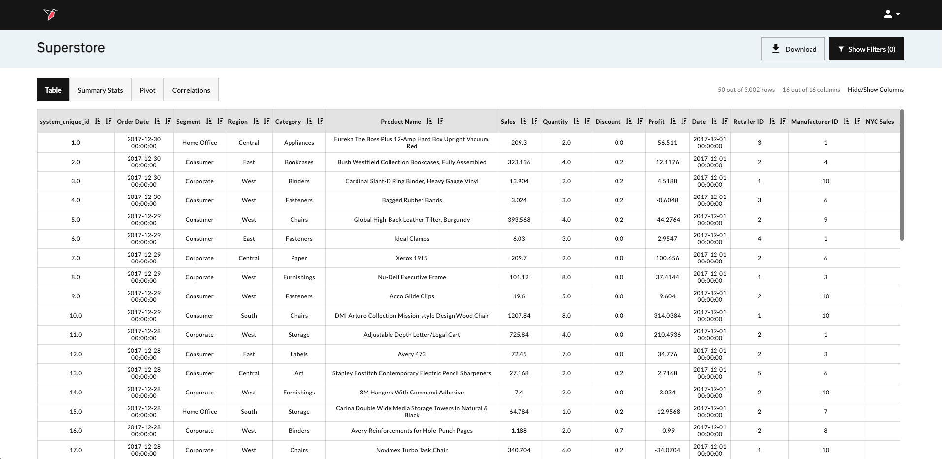 The dataset below was uploaded into the Redbird Platform and includes a free-form text column called Product