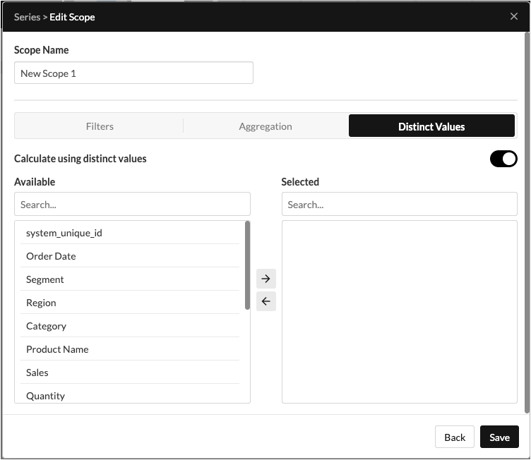 - Add any Distinct Values criteria to restrict the dataset based on unique rows across a selected number of columns