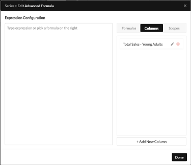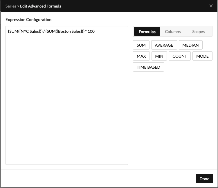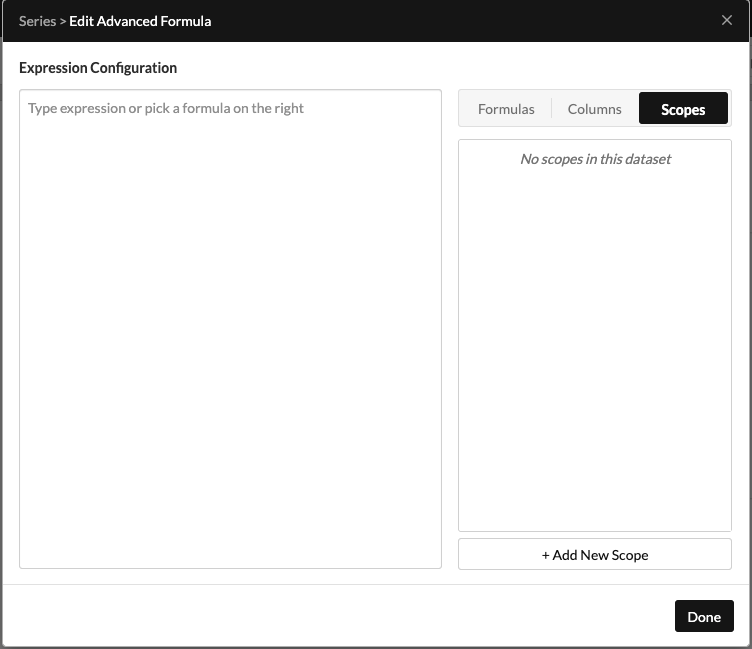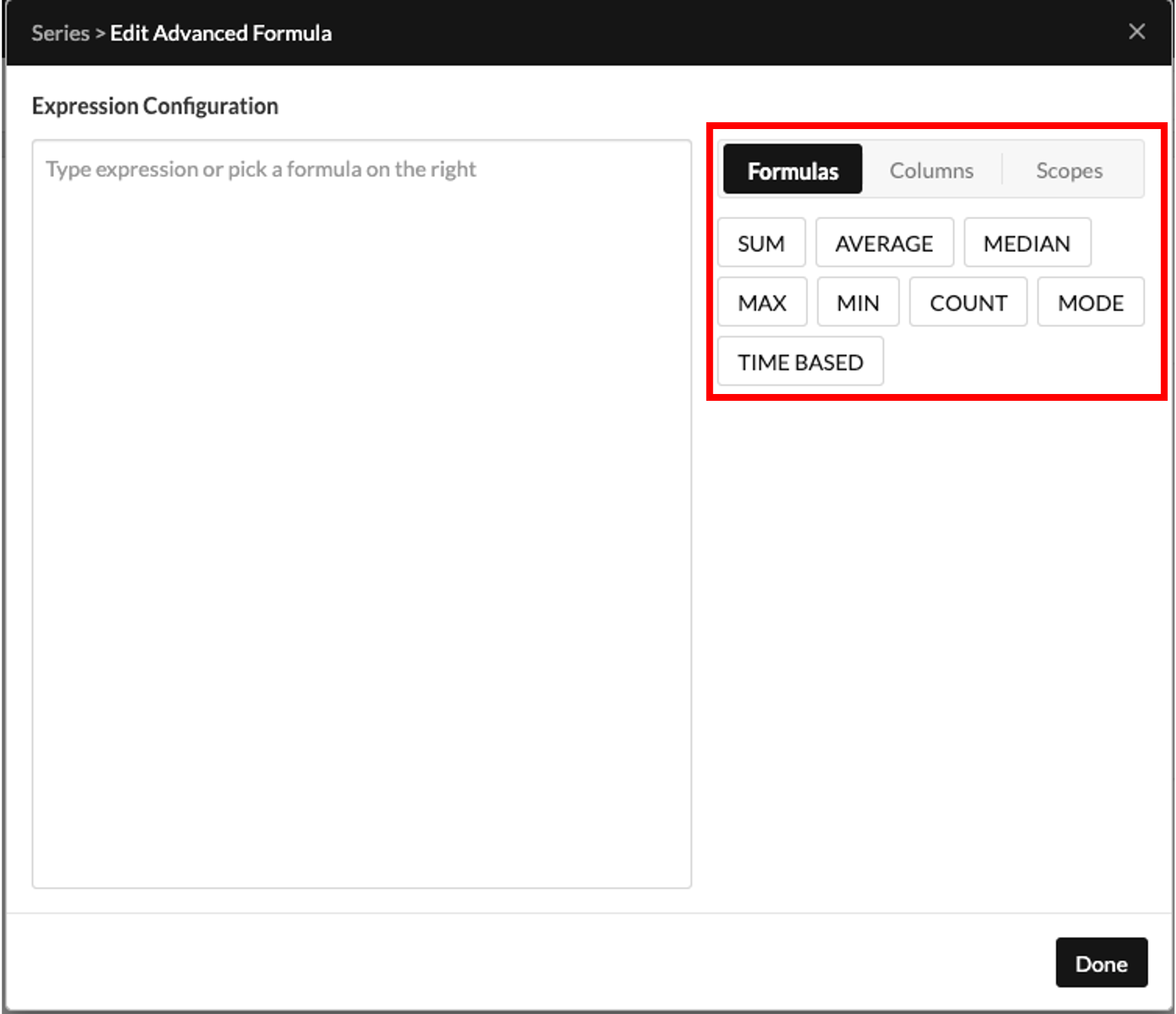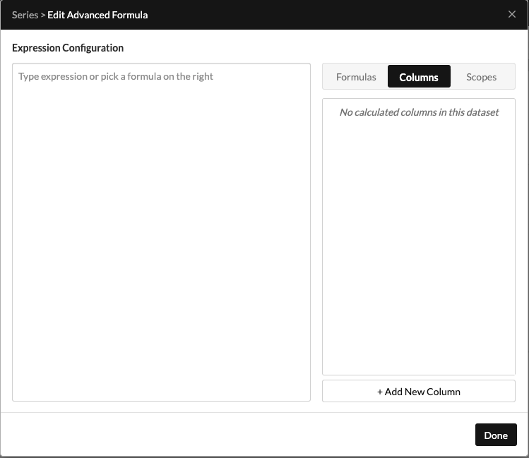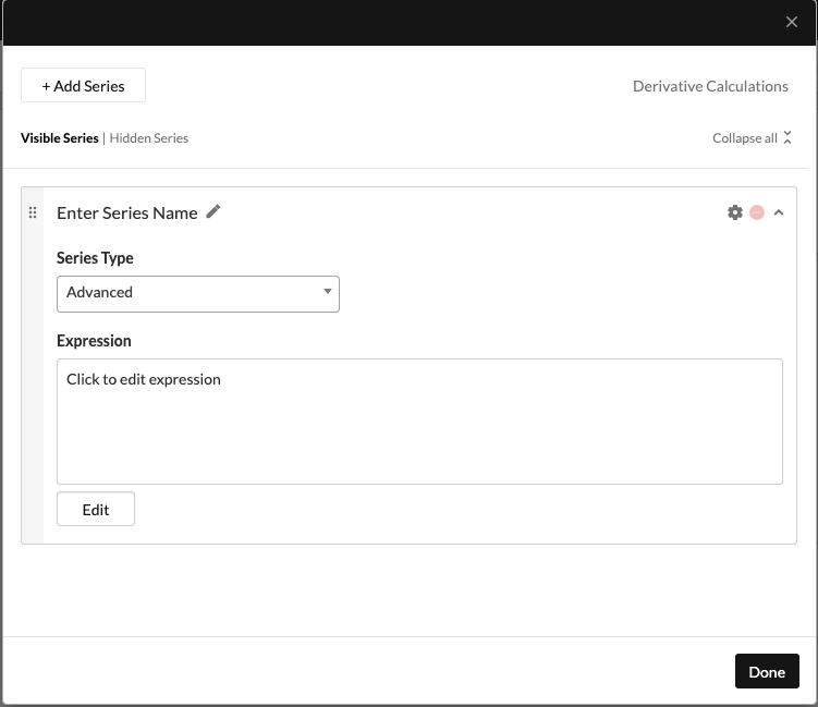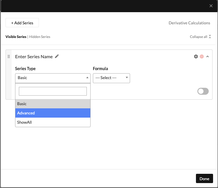 - To access the Advanced Formulas Expression Builder, click on the Advanced toggle within any Series section of your dashboard object’s configuration view.