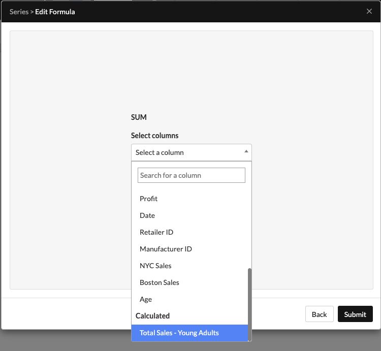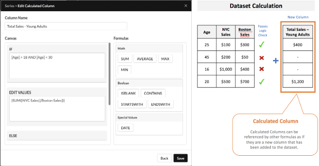 - Once Calculated Columns have been created, you can use them within Formula configurations just as you would have regular Columns that were already fields within your source dataset.