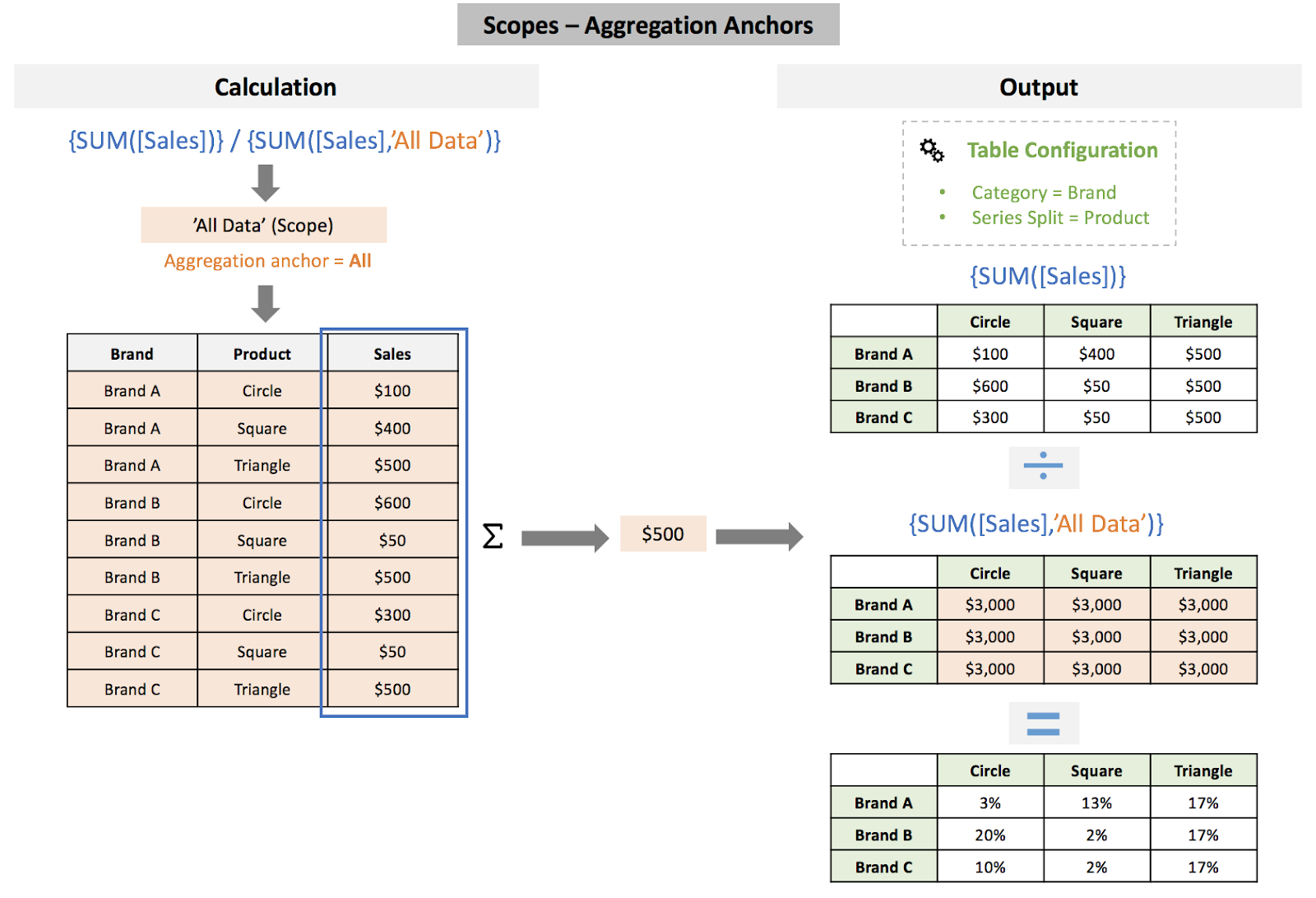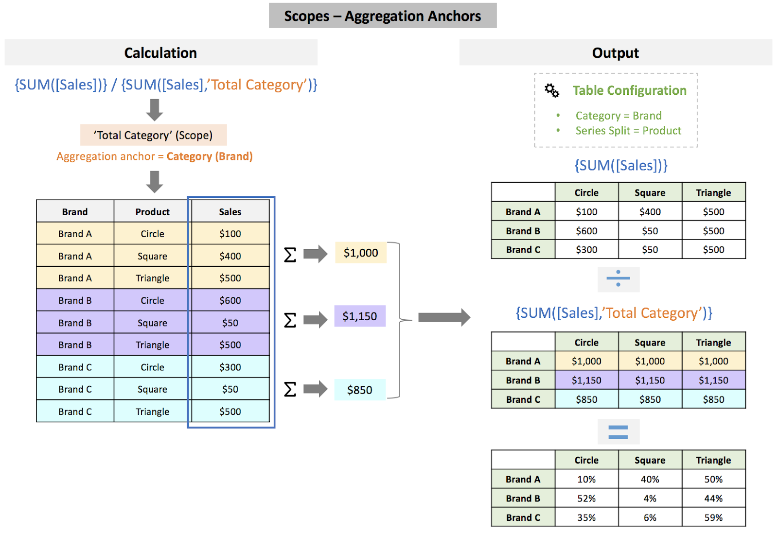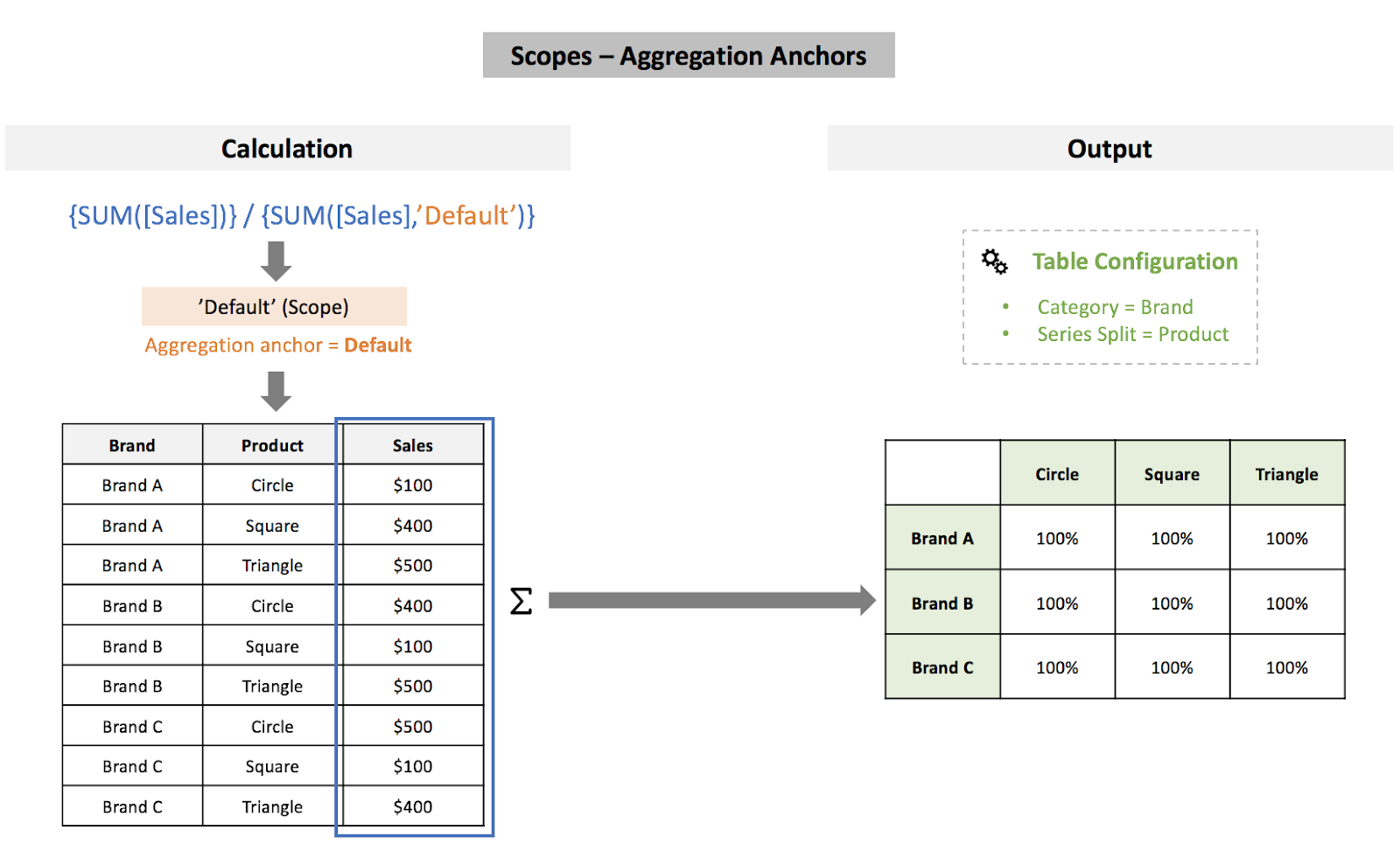 - Aggregation Anchors conceptually set your desired subset of data within your calculation to one of four options: Default, Category, Split, or All