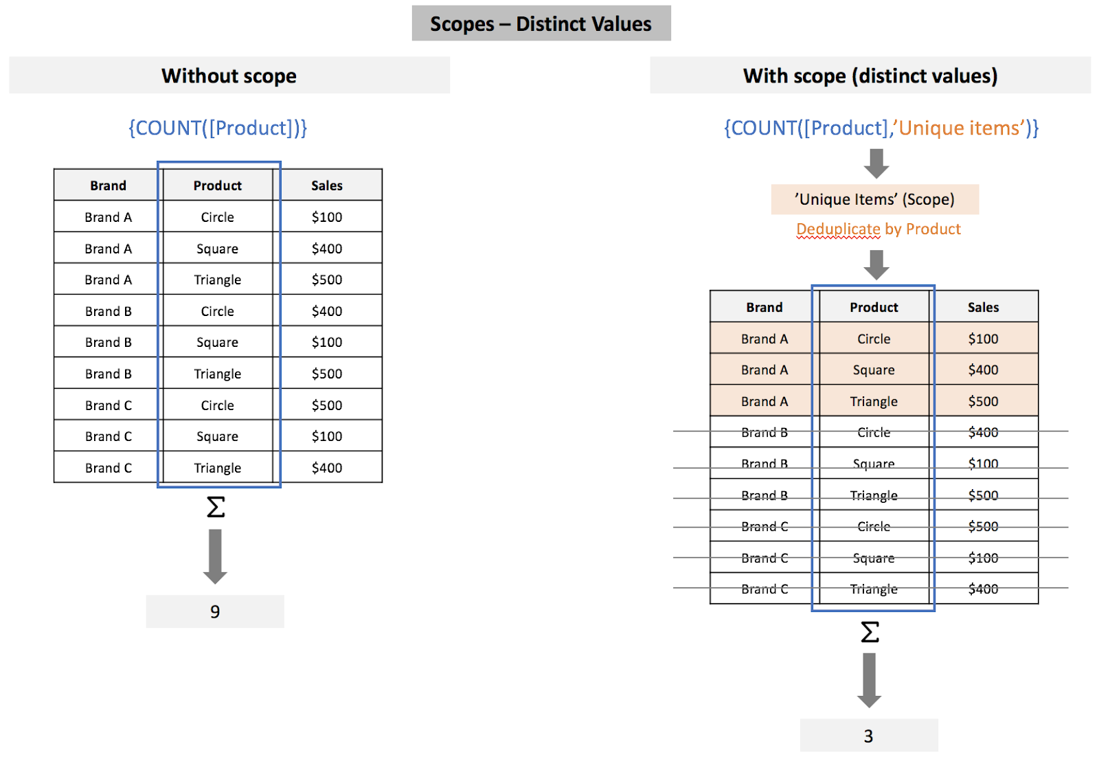 - In the example below, we can see how adding a Distinct Values criteria (Deduplicate by Product) to our Scope impacts the result for a Formula that calculates the Count of values for our dataset