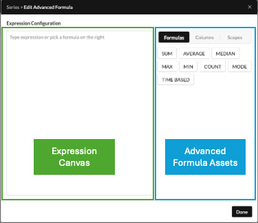 Your Expression Builder will initially contain an empty Expression Canvas and Assets area to the right of the Expression Canvas. You are now ready to configure your Advanced Formula.