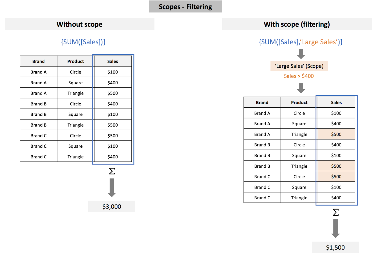 - In the example below, we can see how adding a Filter (Sales > $400) to our Scope impacts the result for a Formula that calculates the Sum of Sales for our dataset