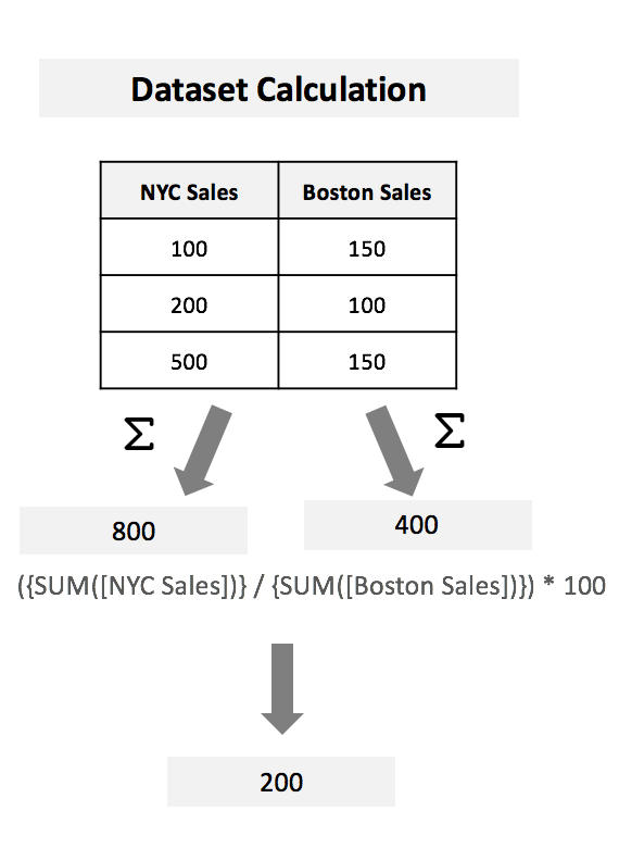 ImportantWithin a Calculated Column configuration, the Edit Values Expression calculates output values by applying Formulas to the dataset 'horizontally', so a Formula can have multiple Columns selected within its configuration. In the example given below, SUM([NYC Sales], [Boston Sales]) will iterate row by row and sum the values within the NYC Sales and Boston Sales columns horizontally for that row and drop the output value from the calculation into the new Calculated Column as the value for that row. If your Edit Values Expression also has Mathematical operators they will take the values resulting from all Formula calculations and produce meta calculations using those values on a row-by-row basis. In the below example, after Formulas have finished calculating for the first row in the dataset, the expression is equivalent to: