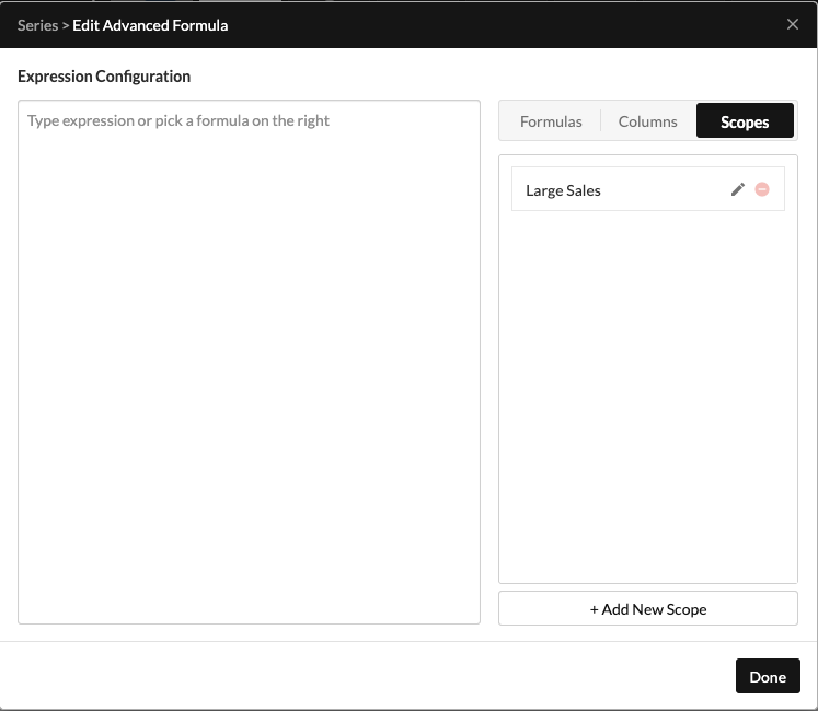 Important:Deleting a Scope will invalidate any Formula that is currently using that Scope within its calculation. Proceed carefully and check with collaborators that are working with you on the dashboard before deleting a Scope.
