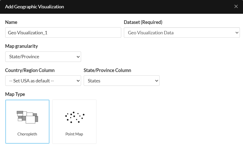 You can visualize location-based data on a map using Redbird's Geographic Visualization (GeoViz) Chart.