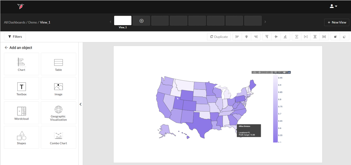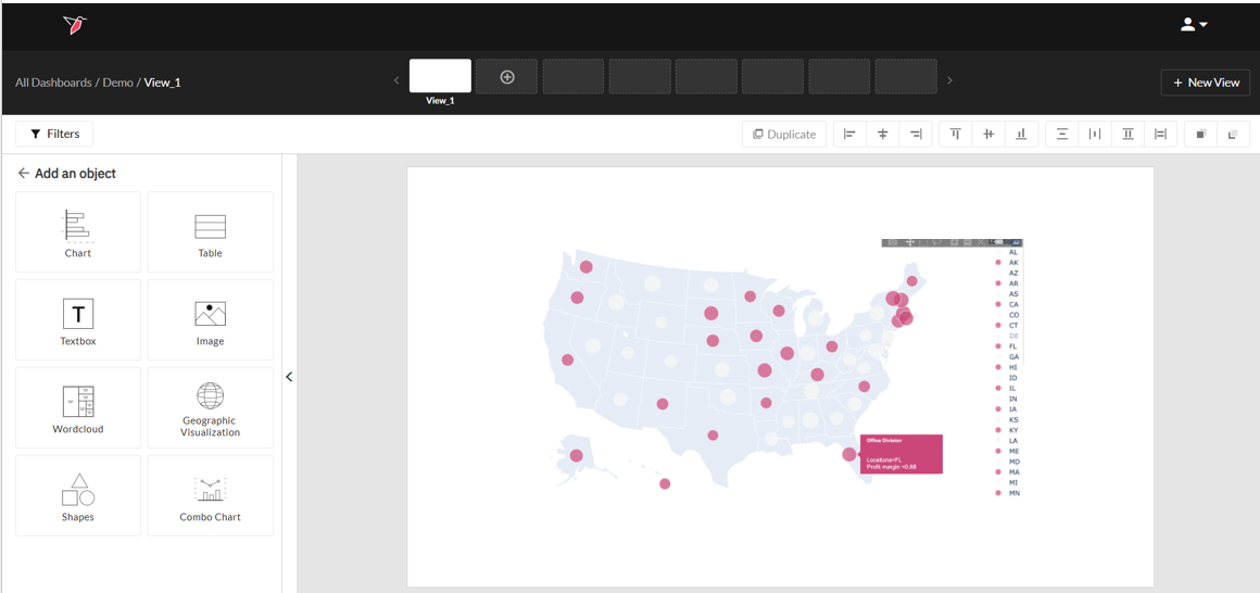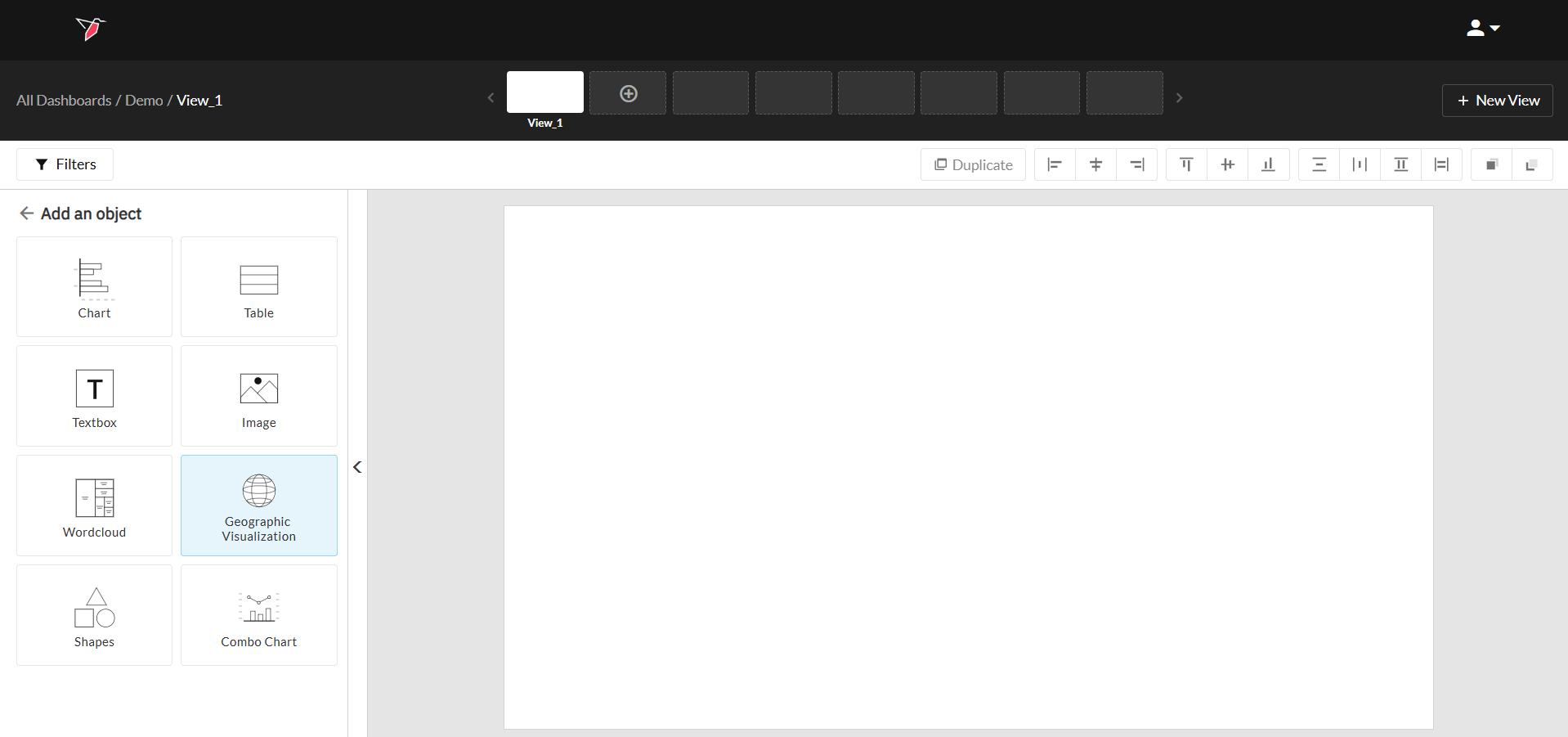 Once your dataset is connected to the dashboard node, double click the view where you want to create a GeoViz chart. See our guides for generating datasets and building dashboards, if required. Then follow these steps: