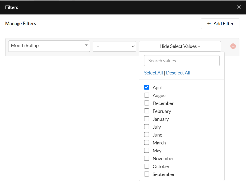 - Add one or more filters if required, by clicking Edit on the Filters dropdown, then selecting the column, operator, and value.