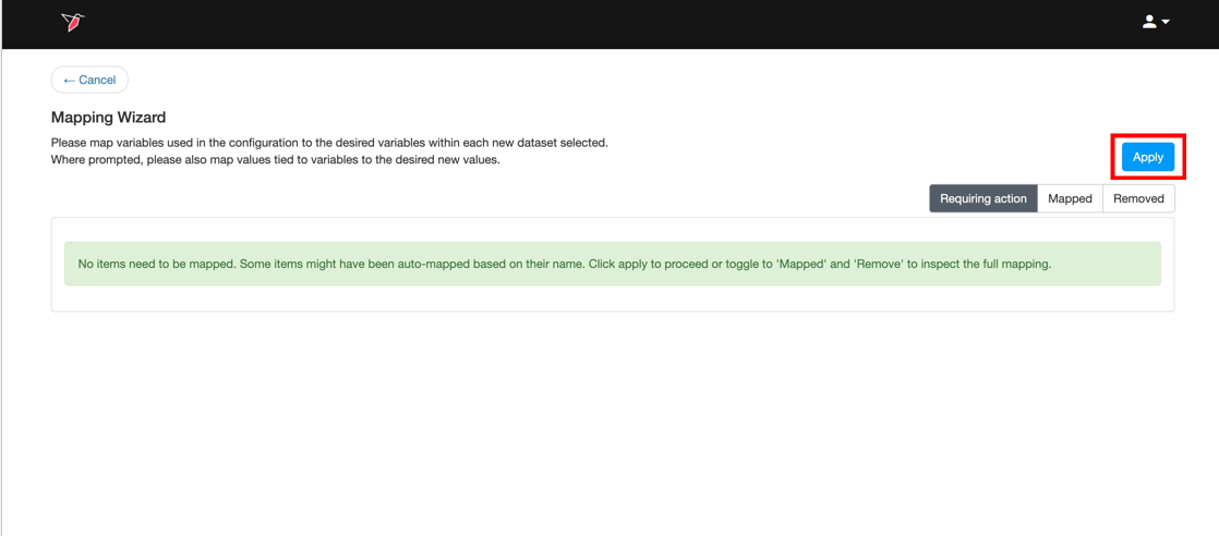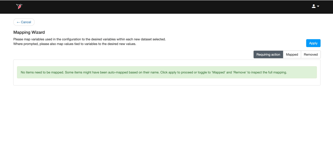 - Map the variables from your new dataset to the corresponding variables in your old dataset by using the dropdown associated with each variable in your new dataset. As each variable is successfully mapped, it will transition to the Mapped tab in the upper right corner of the screen. When all of the variables that require mapping have been mapped, a message that begins with “No items need to be mapped” will appear on the screen.