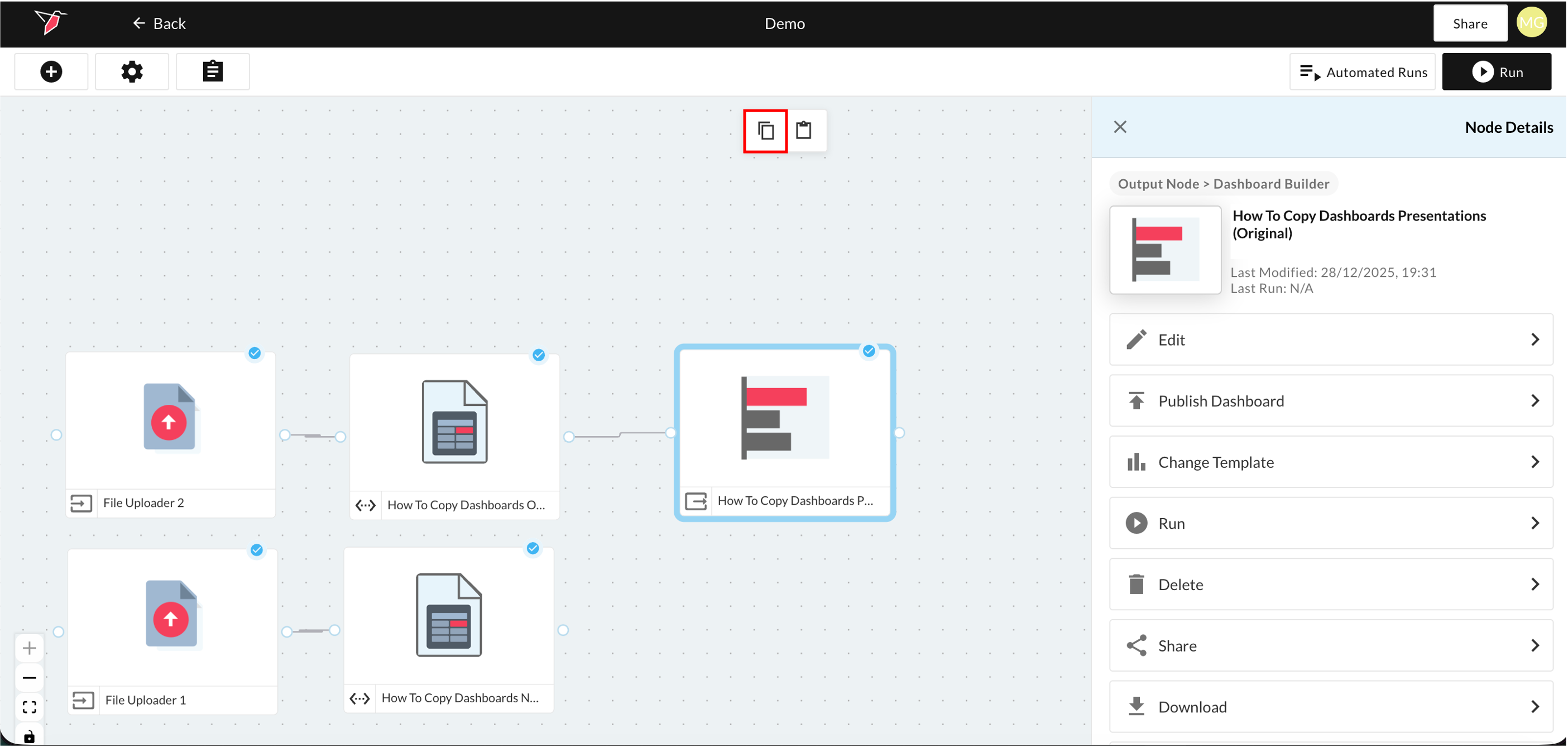 - Click the Dashboard Builder node that you want to copy and select the copy button at the top of the workflow canvas. You can place the node on the same canvas or a new one. Go to the canvas where you want to paste the copied dashboard.
