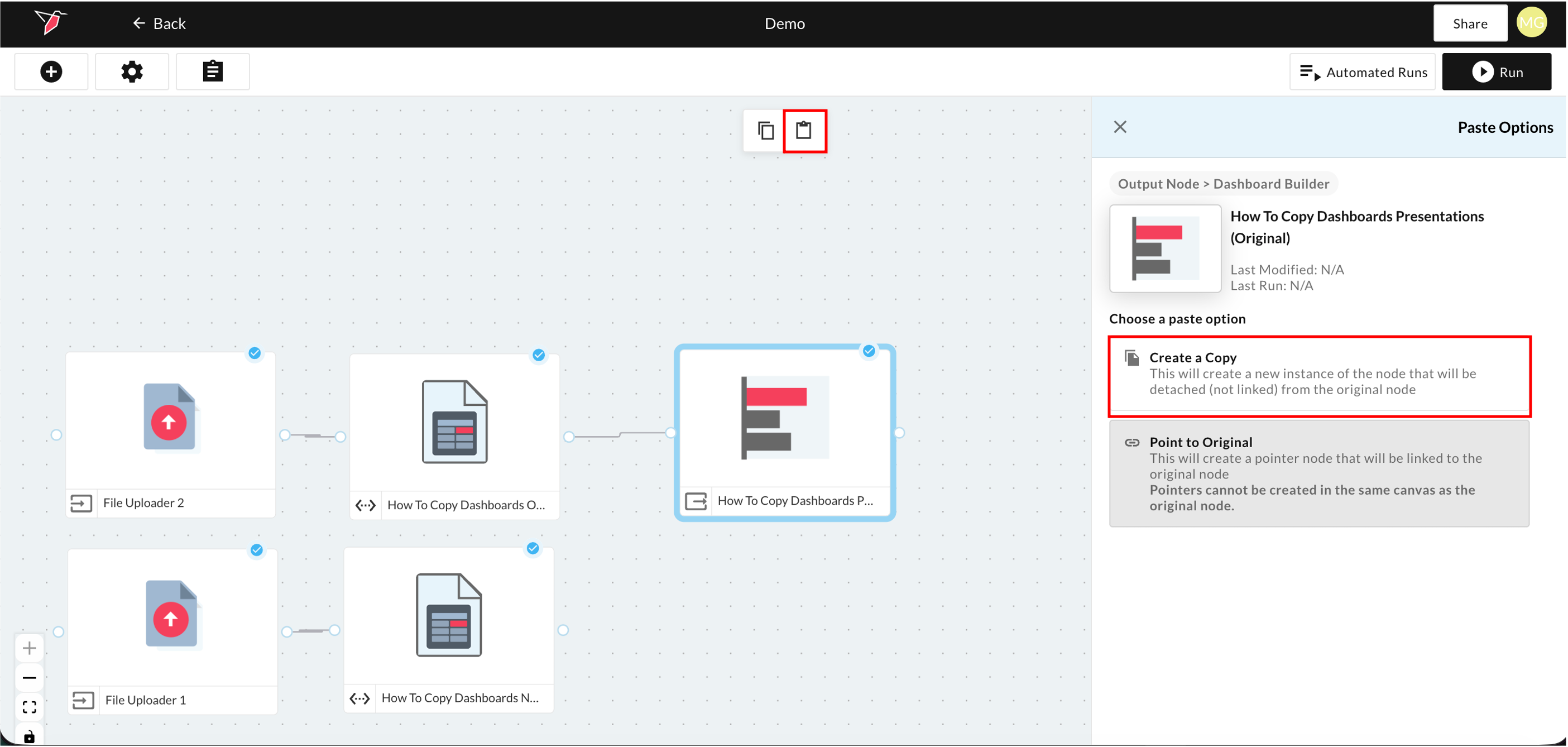 - Select the Paste icon at the top of the workflow canvas and select the "Create a Copy" option.